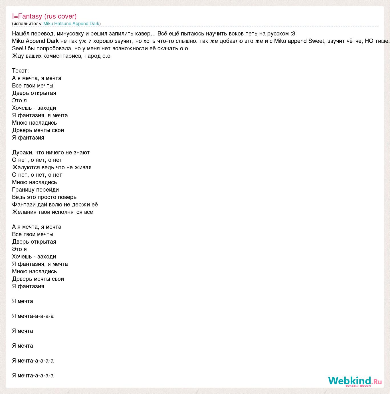 Нашёл перевод, минусовку и решил запилить кавер... Всё ещё пытаюсь научить воков петь на русском :3 Miku Append Dark не так уж и хорошо звучит, но хоть что-то слышно. так же добавлю это же и с Miku append Sweet, звучит чётче, НО тише. SeeU бы попробовала, но у меня нет возможности её скачать о.о Жду ваших комментариев, народ о.о Текст: А я мечта, я мечта Все твои мечты Дверь открытая Это я Хочешь - заходи Я фантазия, я мечта Мною насладись Доверь мечты свои Я фантазия Дураки, что ничего не знают О нет, о нет, о нет Жалуются ведь что не живая О нет, о нет, о нет Мною насладись Границу перейди Ведь это просто поверь Фантази дай волю не держи её Желания твои исполнятся все А я мечта, я мечта Все твои мечты Дверь открытая Это я Хочешь - заходи Я фантазия, я мечта Мною насладись Доверь мечты свои Я фантазия Я мечта Я мечта-а-а-а-а Я мечта Я мечта Я мечта-а-а-а-а Я мечта-а-а-а-а