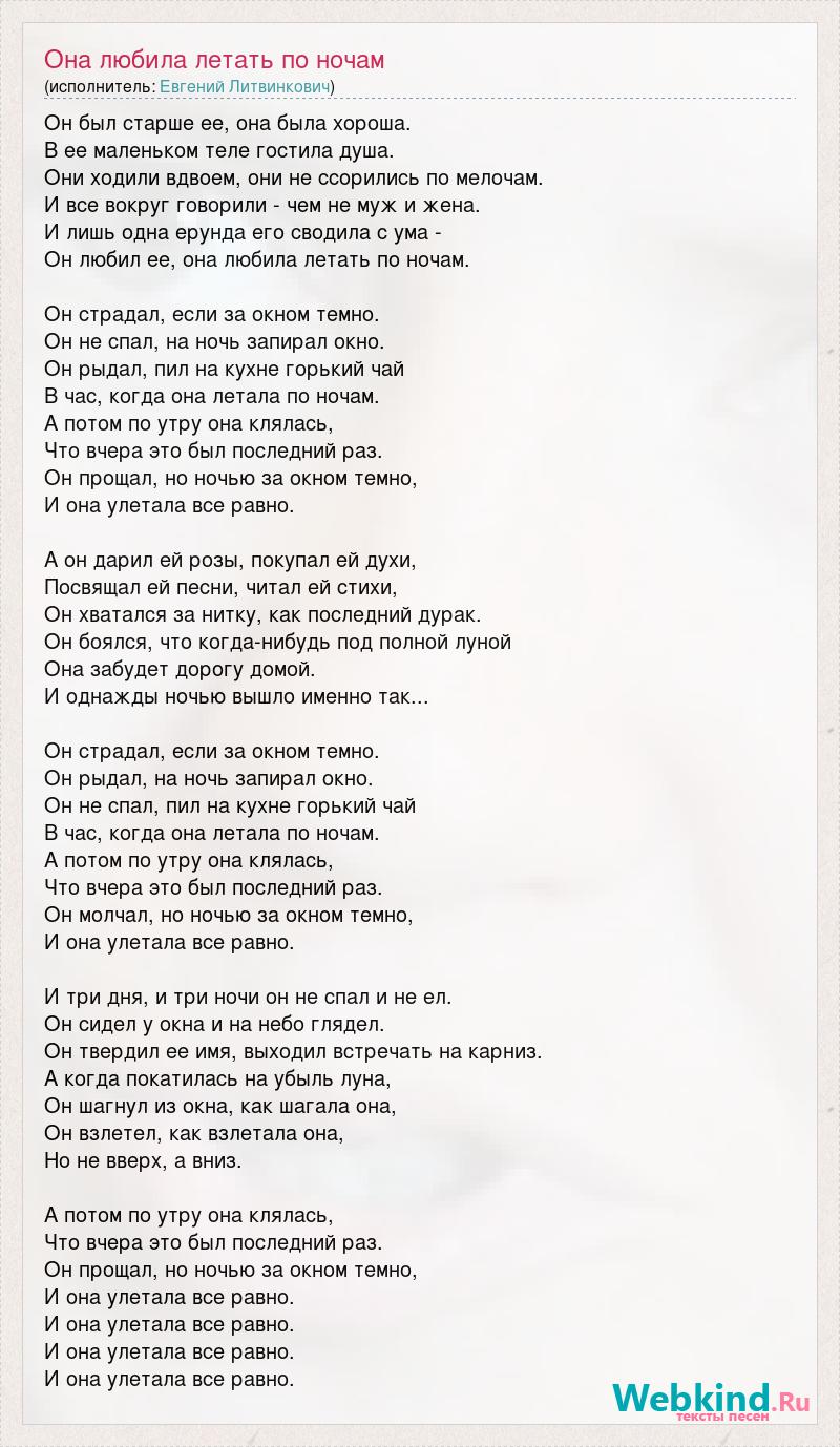 Он был старше ее, она была хороша. В ее маленьком теле гостила душа. Они ходили вдвоем, они не ссорились по мелочам. И все вокруг говорили - чем не муж и жена. И лишь одна ерунда его сводила с ума - Он любил ее, она любила летать по ночам. Он страдал, если за окном темно. Он не спал, на ночь запирал окно. Он рыдал, пил на кухне горький чай В час, когда она летала по ночам. А потом по утру она клялась, Что вчера это был последний раз. Он прощал, но ночью за окном темно, И она улетала все равно. А он дарил ей розы, покупал ей духи, Посвящал ей песни, читал ей стихи, Он хватался за нитку, как последний дурак. Он боялся, что когда-нибудь под полной луной Она забудет дорогу домой. И однажды ночью вышло именно так... Он страдал, если за окном темно. Он рыдал, на ночь запирал окно. Он не спал, пил на кухне горький чай В час, когда она летала по ночам. А потом по утру она клялась, Что вчера это был последний раз. Он молчал, но ночью за окном темно, И она улетала все равно. И три дня, и три ночи он не спал и не ел. Он сидел у окна и на небо глядел. Он твердил ее имя, выходил встречать на карниз. А когда покатилась на убыль луна, Он шагнул из окна, как шагала она, Он взлетел, как взлетала она, Но не вверх, а вниз. А потом по утру она клялась, Что вчера это был последний раз. Он прощал, но ночью за окном темно, И она улетала все равно. И она улетала все равно. И она улетала все равно. И она улетала все равно.