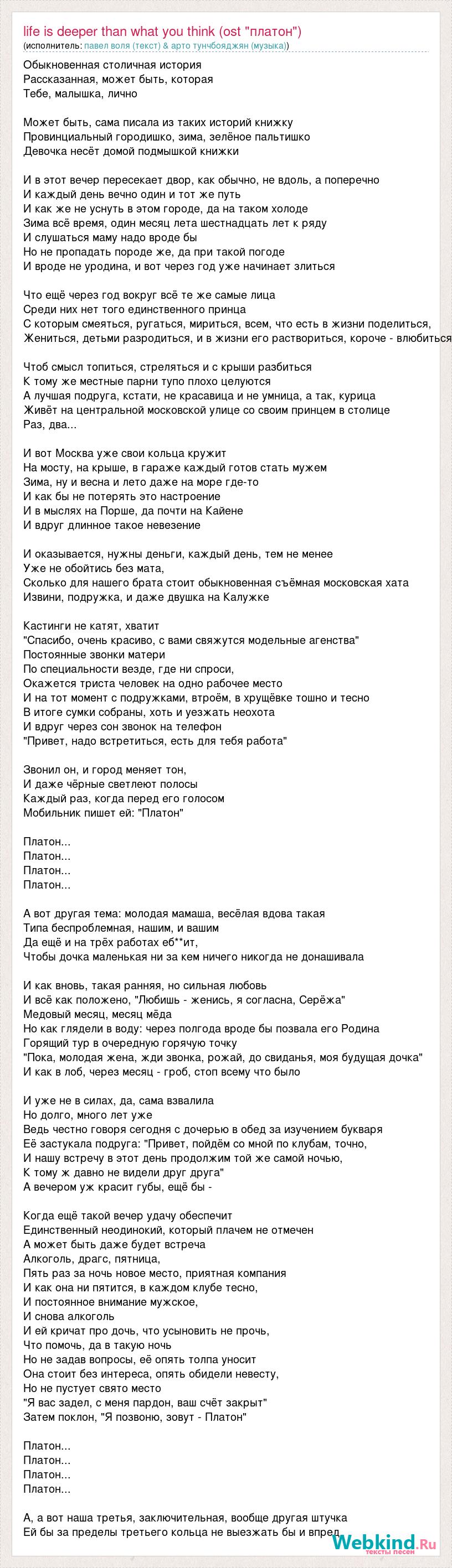 Обыкновенная столичная история Рассказанная, может быть, которая Тебе, малышка, лично Может быть, сама писала из таких историй книжку Провинциальный городишко, зима, зелёное пальтишко Девочка несёт домой подмышкой книжки И в этот вечер пересекает двор, как обычно, не вдоль, а поперечно И каждый день вечно один и тот же путь И как же не уснуть в этом городе, да на таком холоде Зима всё время, один месяц лета шестнадцать лет к ряду И слушаться маму надо вроде бы Но не пропадать породе же, да при такой погоде И вроде не уродина, и вот через год уже начинает злиться Что ещё через год вокруг всё те же самые лица Среди них нет того единственного принца С которым смеяться, ругаться, мириться, всем, что есть в жизни поделиться, Жениться, детьми разродиться, и в жизни его раствориться, короче - влюбиться Чтоб смысл топиться, стреляться и с крыши разбиться К тому же местные парни тупо плохо целуются А лучшая подруга, кстати, не красавица и не умница, а так, курица Живёт на центральной московской улице со своим принцем в столице Раз, два... И вот Москва уже свои кольца кружит На мосту, на крыше, в гараже каждый готов стать мужем Зима, ну и весна и лето даже на море где-то И как бы не потерять это настроение И в мыслях на Порше, да почти на Кайене И вдруг длинное такое невезение И оказывается, нужны деньги, каждый день, тем не менее Уже не обойтись без мата, Cколько для нашего брата стоит обыкновенная съёмная московская хата Извини, подружка, и даже двушка на Калужке Кастинги не катят, хватит "Спасибо, очень красиво, с вами свяжутся модельные агенства" Постоянные звонки матери По специальности везде, где ни спроси, Окажется триста человек на одно рабочее место И на тот момент с подружками, втроём, в хрущёвке тошно и тесно В итоге сумки собраны, хоть и уезжать неохота И вдруг через сон звонок на телефон "Привет, надо встретиться, есть для тебя работа" Звонил он, и город меняет тон, И даже чёрные светлеют полосы Каждый раз, когда перед его голосом Мобильник пишет ей: "Платон" Платон... Платон... Платон... Платон... А вот другая тема: молодая мамаша, весёлая вдова такая Типа беспроблемная, нашим, и вашим Да ещё и на трёх работах еб**ит, Чтобы дочка маленькая ни за кем ничего никогда не донашивала И как вновь, такая ранняя, но сильная любовь И всё как положено, "Любишь - женись, я согласна, Серёжа" Медовый месяц, месяц мёда Но как глядели в воду: через полгода вроде бы позвала его Родина Горящий тур в очередную горячую точку "Пока, молодая жена, жди звонка, рожай, до свиданья, моя будущая дочка" И как в лоб, через месяц - гроб, стоп всему что было И уже не в силах, да, сама взвалила Но долго, много лет уже Ведь честно говоря сегодня с дочерью в обед за изучением букваря Её застукала подруга: "Привет, пойдём со мной по клубам, точно, И нашу встречу в этот день продолжим той же самой ночью, К тому ж давно не видели друг друга" А вечером уж красит губы, ещё бы - Когда ещё такой вечер удачу обеспечит Единственный неодинокий, который плачем не отмечен А может быть даже будет встреча Алкоголь, драгс, пятница, Пять раз за ночь новое место, приятная компания И как она ни пятится, в каждом клубе тесно, И постоянное внимание мужское, И снова алкоголь И ей кричат про дочь, что усыновить не прочь, Что помочь, да в такую ночь Но не задав вопросы, её опять толпа уносит Она стоит без интереса, опять обидели невесту, Но 