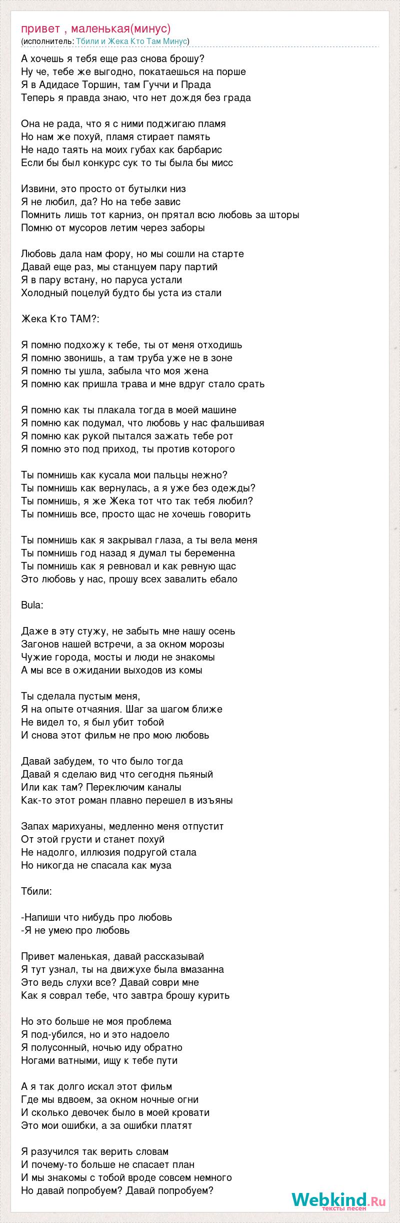 А хочешь я тебя еще раз снова брошу? Ну че, тебе же выгодно, покатаешься на порше Я в Адидасе Торшин, там Гуччи и Прада Теперь я правда знаю, что нет дождя без града Она не рада, что я с ними поджигаю пламя Но нам же похуй, пламя стирает память Не надо таять на моих губах как барбарис Если бы был конкурс сук то ты была бы мисс Извини, это просто от бутылки низ Я не любил, да? Но на тебе завис Помнить лишь тот карниз, он прятал всю любовь за шторы Помню от мусоров летим через заборы Любовь дала нам фору, но мы сошли на старте Давай еще раз, мы станцуем пару партий Я в пару встану, но паруса устали Холодный поцелуй будто бы уста из стали Жека Кто ТАМ?: Я помню подхожу к тебе, ты от меня отходишь Я помню звонишь, а там труба уже не в зоне Я помню ты ушла, забыла что моя жена Я помню как пришла трава и мне вдруг стало срать Я помню как ты плакала тогда в моей машине Я помню как подумал, что любовь у нас фальшивая Я помню как рукой пытался зажать тебе рот Я помню это под приход, ты против которого Ты помнишь как кусала мои пальцы нежно? Ты помнишь как вернулась, а я уже без одежды? Ты помнишь, я же Жека тот что так тебя любил? Ты помнишь все, просто щас не хочешь говорить Ты помнишь как я закрывал глаза, а ты вела меня Ты помнишь год назад я думал ты беременна Ты помнишь как я ревновал и как ревную щас Это любовь у нас, прошу всех завалить ебало Bula: Даже в эту стужу, не забыть мне нашу осень Загонов нашей встречи, а за окном морозы Чужие города, мосты и люди не знакомы А мы все в ожидании выходов из комы Ты сделала пустым меня, Я на опыте отчаяния. Шаг за шагом ближе Не видел то, я был убит тобой И снова этот фильм не про мою любовь Давай забудем, то что было тогда Давай я сделаю вид что сегодня пьяный Или как там? Переключим каналы Как-то этот роман плавно перешел в изъяны Запах марихуаны, медленно меня отпустит От этой грусти и станет похуй Не надолго, иллюзия подругой стала Но никогда не спасала как муза Тбили: -Напиши что нибудь про любовь -Я не умею про любовь Привет маленькая, давай рассказывай Я тут узнал, ты на движухе была вмазанна Это ведь слухи все? Давай соври мне Как я соврал тебе, что завтра брошу курить Но это больше не моя проблема Я под-убился, но и это надоело Я полусонный, ночью иду обратно Ногами ватными, ищу к тебе пути А я так долго искал этот фильм Где мы вдвоем, за окном ночные огни И сколько девочек было в моей кровати Это мои ошибки, а за ошибки платят Я разучился так верить словам И почему-то больше не спасает план И мы знакомы с тобой вроде совсем немного Но давай попробуем? Давай попробуем?