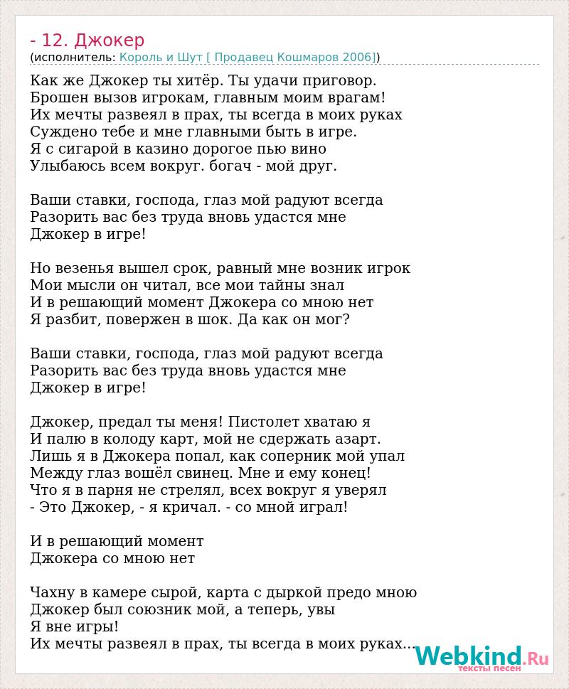 Как же Джокер ты хитёр. Ты удачи приговор. Брошен вызов игрокам, главным моим врагам! Их мечты развеял в прах, ты всегда в моих руках Суждено тебе и мне главными быть в игре. Я с сигарой в казино дорогое пью вино Улыбаюсь всем вокруг. богач - мой друг. Ваши ставки, господа, глаз мой радуют всегда Разорить вас без труда вновь удастся мне Джокер в игре! Но везенья вышел срок, равный мне возник игрок Мои мысли он читал, все мои тайны знал И в решающий момент Джокера со мною нет Я разбит, повержен в шок. Да как он мог? Ваши ставки, господа, глаз мой радуют всегда Разорить вас без труда вновь удастся мне Джокер в игре! Джокер, предал ты меня! Пистолет хватаю я И палю в колоду карт, мой не сдержать азарт. Лишь я в Джокера попал, как соперник мой упал Между глаз вошёл свинец. Мне и ему конец! Что я в парня не стрелял, всех вокруг я уверял - Это Джокер, - я кричал. - со мной играл! И в решающий момент Джокера со мною нет Чахну в камере сырой, карта с дыркой предо мною Джокер был союзник мой, а теперь, увы Я вне игры! Их мечты развеял в прах, ты всегда в моих руках....