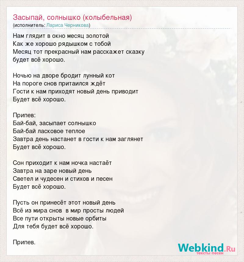 Нам глядит в окно месяц золотой Как же хорошо рядышком с тобой Месяц тот прекрасный нам расскажет сказку будет всё хорошо. Ночью на дворе бродит лунный кот На пороге снов притаился ждёт Гости к нам приходят новый день приводит Будет всё хорошо. Припев: Бай-бай, засыпает солнышко Бай-бай ласковое теплое Завтра день настанет в гости к нам заглянет Будет всё хорошо. Сон приходит к нам ночка настаёт Завтра на заре новый день Светел и чудесен и стихов и песен Будет всё хорошо. Пусть он принесёт этот новый день Всё из мира снов в мир просты людей Все пути открыты новые орбиты Для тебя будет всё хорошо. Припев.