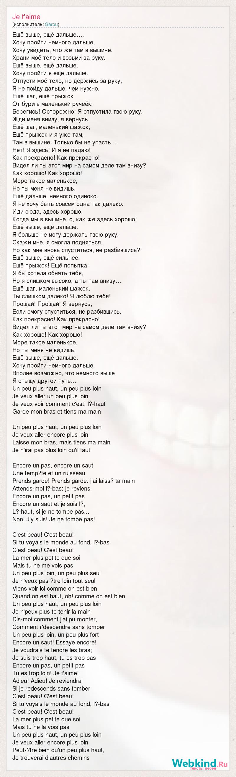Ещё выше, ещё дальше…. Хочу пройти немного дальше, Хочу увидеть, что же там в вышине. Храни моё тело и возьми за руку. Ещё выше, ещё дальше. Хочу пройти я ещё дальше. Отпусти моё тело, но держись за руку, Я не пойду дальше, чем нужно. Ещё шаг, ещё прыжок От бури в маленький ручеёк. Берегись! Осторожно! Я отпустила твою руку. Жди меня внизу, я вернусь. Ещё шаг, маленький шажок, Ещё прыжок и я уже там, Там в вышине. Только бы не упасть… Нет! Я здесь! И я не падаю! Как прекрасно! Как прекрасно! Видел ли ты этот мир на самом деле там внизу? Как хорошо! Как хорошо! Море такое маленькое, Но ты меня не видишь. Ещё дальше, немного одиноко. Я не хочу быть совсем одна так далеко. Иди сюда, здесь хорошо. Когда мы в вышине, о, как же здесь хорошо! Ещё выше, ещё дальше. Я больше не могу держать твою руку. Скажи мне, я смогла подняться, Но как мне вновь спуститься, не разбившись? Ещё выше, ещё сильнее. Ещё прыжок! Ещё попытка! Я бы хотела обнять тебя, Но я слишком высоко, а ты там внизу… Ещё шаг, маленький шажок. Ты слишком далеко! Я люблю тебя! Прощай! Прощай! Я вернусь, Если смогу спуститься, не разбившись. Как прекрасно! Как прекрасно! Видел ли ты этот мир на самом деле там внизу? Как хорошо! Как хорошо! Море такое маленькое, Но ты меня не видишь. Ещё выше, ещё дальше. Хочу пройти немного дальше. Вполне возможно, что немного выше Я отыщу другой путь… Un peu plus haut, un peu plus loin Je veux aller un peu plus loin Je veux voir comment c'est, l?-haut Garde mon bras et tiens ma main Un peu plus haut, un peu plus loin Je veux aller encore plus loin Laisse mon bras, mais tiens ma main Je n'irai pas plus loin qu'il faut Encore un pas, encore un saut Une temp?te et un ruisseau Prends garde! Prends garde: j'ai laiss? ta main Attends-moi l?-bas: je reviens Encore un pas, un petit pas Encore un saut et je suis l?, L?-haut, si je ne tombe pas... Non! J'y suis! Je ne tombe pas! C'est beau! C'est beau! Si tu voyais le monde au fond, l?-bas C'est beau! C'est beau! La mer plus petite que soi Mais tu ne me vois pas Un peu plus loin, un peu plus seul Je n'veux pas ?tre loin tout seul Viens voir ici comme on est bien Quand on est haut, oh! comme on est bien Un peu plus haut, un peu plus loin Je n'peux plus te tenir la main Dis-moi comment j'ai pu monter, Comment r'descendre sans tomber Un peu plus loin, un peu plus fort Encore un saut! Essaye encore! Je voudrais te tendre les bras; Je suis trop haut, tu es trop bas Encore un pas, un petit pas Tu es trop loin! Je t'aime! Adieu! Adieu! Je reviendrai Si je redescends sans tomber C'est beau! C'est beau! Si tu voyais le monde au fond, l?-bas C'est beau! C'est beau! La mer plus petite que soi Mais tu ne la vois pas Un peu plus haut, un peu plus loin Je veux aller encore plus loin Peut-?tre bien qu'un peu plus haut, Je trouverai d'autres chemins