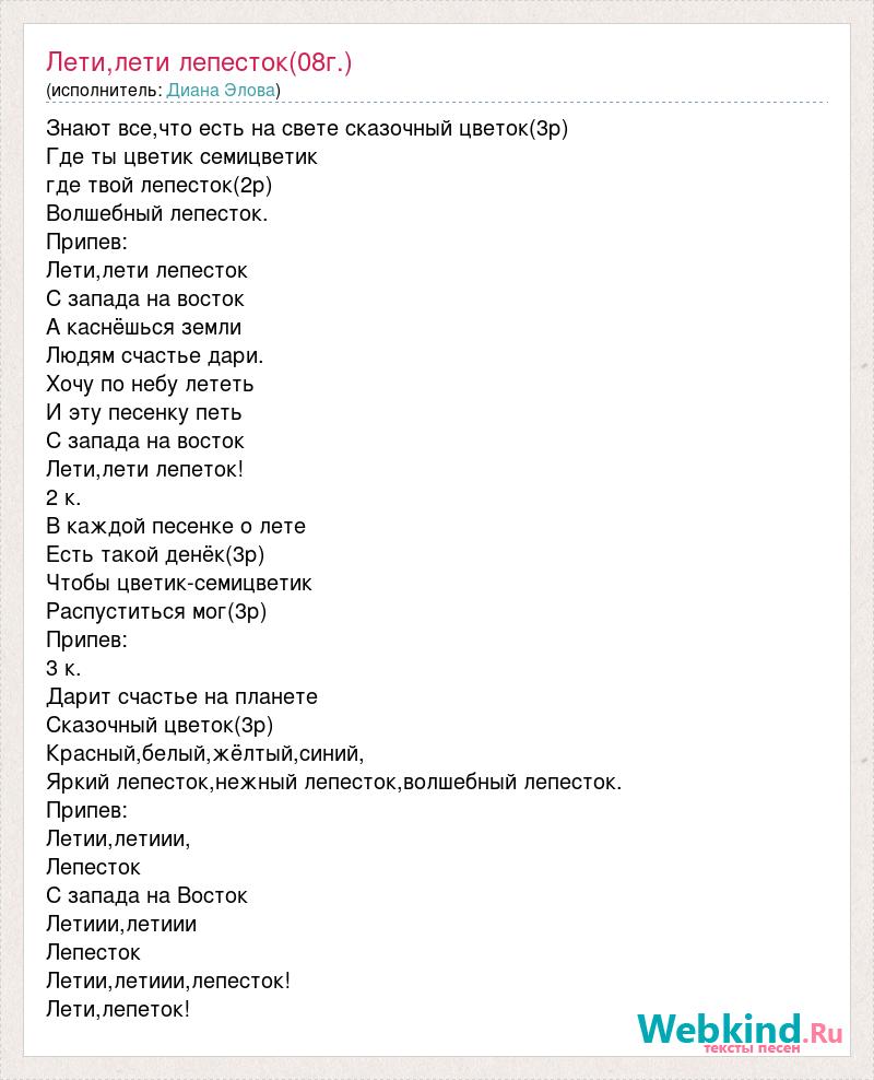 Знают все,что есть на свете сказочный цветок(3р) Где ты цветик семицветик где твой лепесток(2р) Волшебный лепесток. Припев: Лети,лети лепесток С запада на восток А каснёшься земли Людям счастье дари. Хочу по небу лететь И эту песенку петь С запада на восток Лети,лети лепеток! 2 к. В каждой песенке о лете Есть такой денёк(3р) Чтобы цветик-семицветик Распуститься мог(3р) Припев: 3 к. Дарит счастье на планете Сказочный цветок(3р) Красный,белый,жёлтый,синий, Яркий лепесток,нежный лепесток,волшебный лепесток. Припев: Летии,летиии, Лепесток С запада на Восток Летиии,летиии Лепесток Летии,летиии,лепесток! Лети,лепеток!