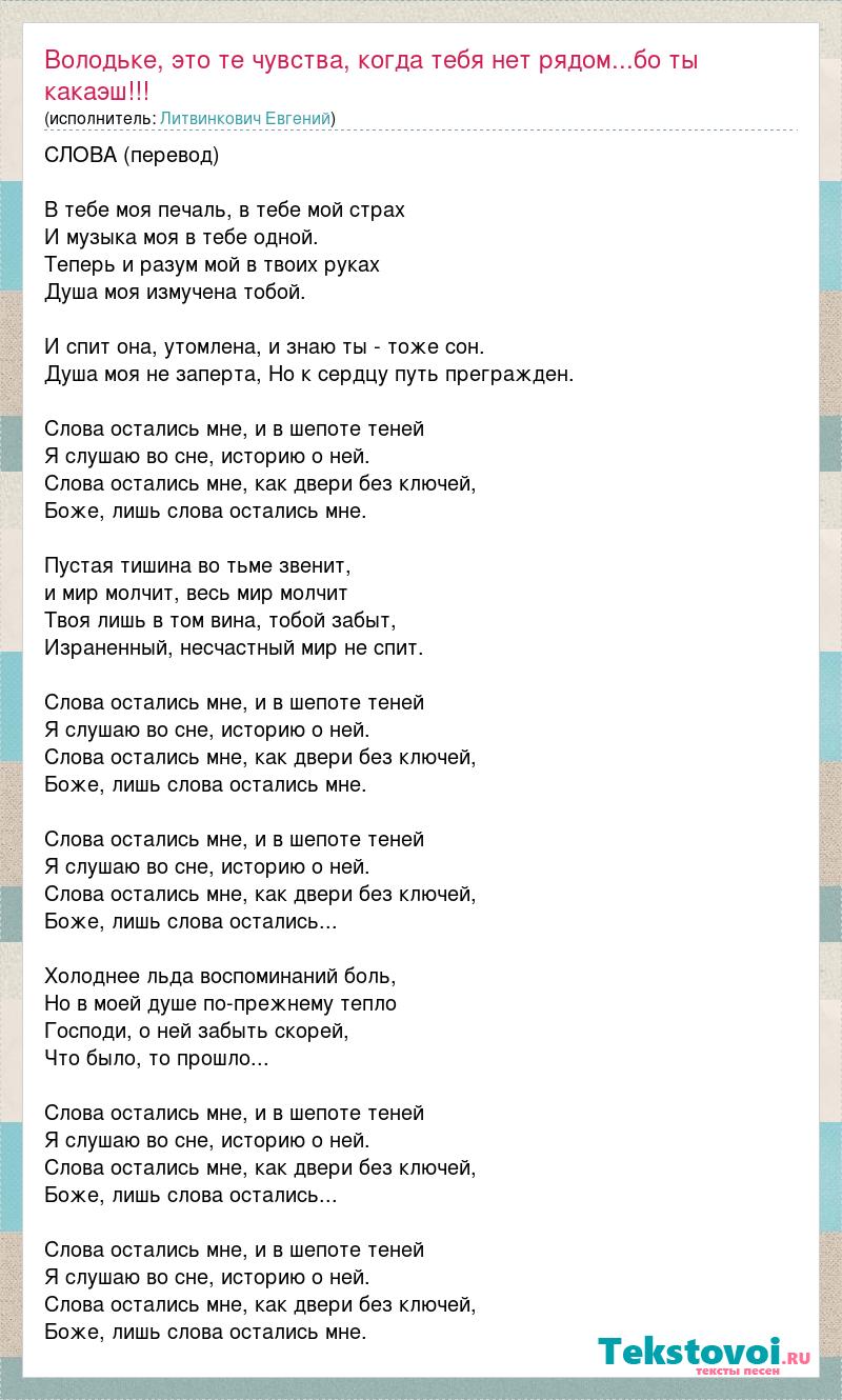 СЛОВА (перевод) В тебе моя печаль, в тебе мой страх И музыка моя в тебе одной. Теперь и разум мой в твоих руках Душа моя измучена тобой. И спит она, утомлена, и знаю ты - тоже сон. Душа моя не заперта, Но к сердцу путь прегражден. Слова остались мне, и в шепоте теней Я слушаю во сне, историю о ней. Слова остались мне, как двери без ключей, Боже, лишь слова остались мне. Пустая тишина во тьме звенит, и мир молчит, весь мир молчит Твоя лишь в том вина, тобой забыт, Израненный, несчастный мир не спит. Слова остались мне, и в шепоте теней Я слушаю во сне, историю о ней. Слова остались мне, как двери без ключей, Боже, лишь слова остались мне. Слова остались мне, и в шепоте теней Я слушаю во сне, историю о ней. Слова остались мне, как двери без ключей, Боже, лишь слова остались... Холоднее льда воспоминаний боль, Но в моей душе по-прежнему тепло Господи, о ней забыть скорей, Что было, то прошло... Слова остались мне, и в шепоте теней Я слушаю во сне, историю о ней. Слова остались мне, как двери без ключей, Боже, лишь слова остались... Слова остались мне, и в шепоте теней Я слушаю во сне, историю о ней. Слова остались мне, как двери без ключей, Боже, лишь слова остались мне.