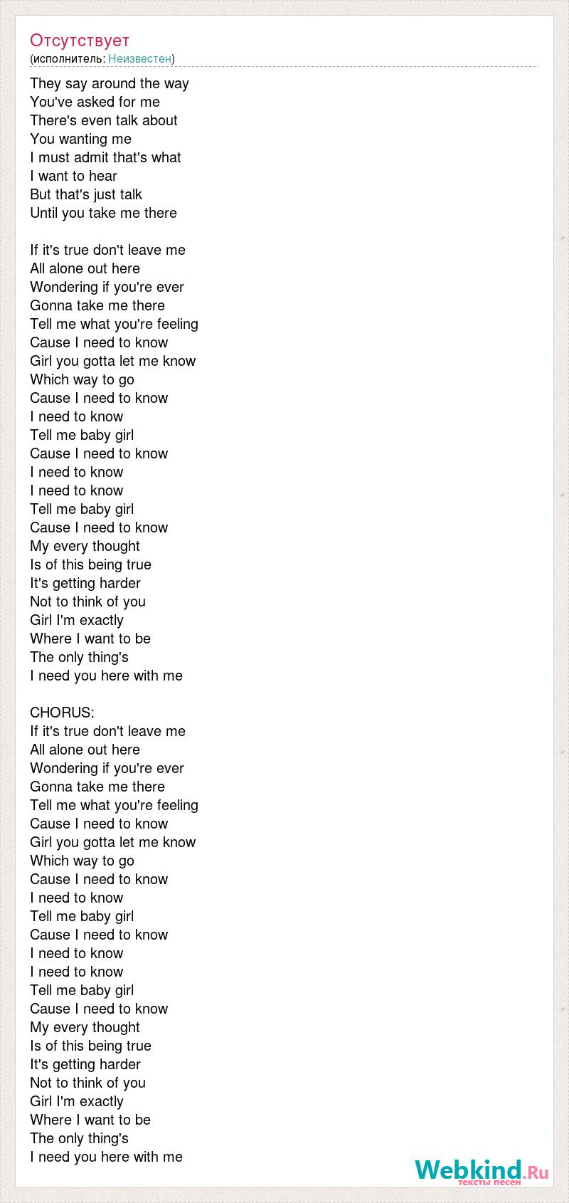 They say around the way You've asked for me There's even talk about You wanting me I must admit that's what I want to hear But that's just talk Until you take me there If it's true don't leave me All alone out here Wondering if you're ever Gonna take me there Tell me what you're feeling Cause I need to know Girl you gotta let me know Which way to go Cause I need to know I need to know Tell me baby girl Cause I need to know I need to know I need to know Tell me baby girl Cause I need to know My every thought Is of this being true It's getting harder Not to think of you Girl I'm exactly Where I want to be The only thing's I need you here with me CHORUS: If it's true don't leave me All alone out here Wondering if you're ever Gonna take me there Tell me what you're feeling Cause I need to know Girl you gotta let me know Which way to go Cause I need to know I need to know Tell me baby girl Cause I need to know I need to know I need to know Tell me baby girl Cause I need to know My every thought Is of this being true It's getting harder Not to think of you Girl I'm exactly Where I want to be The only thing's I need you here with me