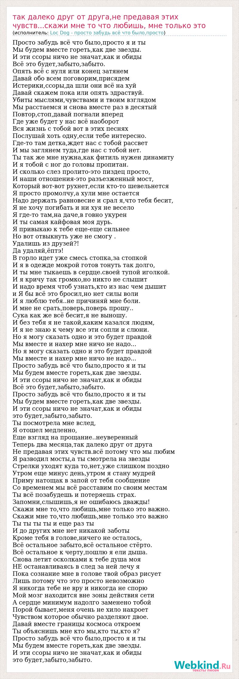 Просто забудь всё что было,просто я и ты Мы будем вместе гореть,как две звезды. И эти ссоры ничо не значат,как и обиды Всё это будет,забыто,забыто. Опять всё с нуля или конец затянем Давай обо всем поговорим,присядем Истерики,ссоры,да шли они всё на хуй Давай скажем пока или опять здраствуй. Убиты мыслями,чувствами и твоим взглядом Мы расстаемся и снова вместе раз в десятый Повтор,стоп,давай погнали вперед Где уже будет у нас всё наоборот Вся жизнь с тобой вот в этих песнях Послушай хоть одну,если тебе интересно. Где-то там детка,ждет нас с тобой рассвет И мы заглянем туда,где нас с тобой нет. Ты так же мне нужна,как фитиль нужен динамиту И я тобой с ног до головы пропитан. И сколько слез пролито-это пиздец просто, И наши отношения-это разъезженный мост, Который вот-вот рухнет,если кто-то шевельнется Я просто промолчу,а хули мне остается Надо держать равновесие и срал я,что тебя бесит, Я не хочу погибать и ни хуя не весело Я где-то там,на даче,в говно укурен И ты самая кайфовая моя дурь. Я привыкаю к тебе еще-еще сильнее Но вот отвыкнуть уже не смогу . Удалишь из друзей?! Да удаляй,ёптэ! В горло идет уже смесь стопка,за стопкой И я в одежде мокрой готов тонуть так долго, И ты мне тыкаешь в сердце.своей тупой иголкой. И я кричу так громко,но никто не слышит И надо время чтоб узнать,кто из нас чем дышит и Я бы всё это бросил,но нет силы воли И я люблю тебя..не причиняй мне боли. И мне не срать,поверь,поверь прошу.. Сука как же всё бесит,я не выношу. И без тебя я не такой,каким казался людям, И я не знаю к чему все эти сопли и слюни. Но я могу сказать одно и это будет правдой Мы вместе и нахер мне ничо не надо... Но я могу сказать одно и это будет правдой Мы вместе и нахер мне ничо не надо... Просто забудь всё что было,просто я и ты Мы будем вместе гореть,как две звезды. И эти ссоры ничо не значат,как и обиды Всё это будет,забыто,забыто. Просто забудь всё что было,просто я и ты Мы будем вместе гореть,как две звезды. И эти ссоры ничо не значат,как и обиды это будет,забыто,забыто. Ты посмотрела мне вслед, Я отошел медленно, Еще взгляд на прощание..неуверенный Теперь два месяца,так далеко друг от друга Не предавая этих чувств.всё потому что мы любим Я разводил мосты,а ты смотрела на звезды Стрелки уходят куда то,нет,уже слишком поздно Утром еще минус день,утром я стану мудрей Приму натощак в запой от тебя сообщение Со временем мы всё расставим по своим местам Ты всё позабудешь и потеряешь страх. Запомни,слышишь,я не ошибаюсь дважды! Скажи мне то,что любишь,мне только это важно. Скажи мне то,что любишь,мне только это важно Ты ты ты ты и еще раз ты И до других мне нет никакой заботы Кроме тебя в голове,ничего не осталось, Всё остальное забыто,всё остальное стёрто. Всё остальное к черту,пошлю я ели дыша. Снова летит осколками к тебе душа моя НЕ останавливаясь в след за ней лечу я Пока сознание мне в голове твой образ рисует Лишь потому что это просто невозможно Я никогда тебе не вру и никогда не спорю Мой мозг находится вне зоны действия сети А сердце минимум надолго заменено тобой Порой бывает,меня очень не хило накроет Чувством которое обычно разделяют двое. Давай вместе границы космоса откроем Ты объяснишь мне кто мы,кто ты,кто я? Просто забудь всё что было,просто я и ты Мы будем вместе гореть,как две звезды. И эти ссоры ничо не значат,как и обиды это будет,забыто,забыто.