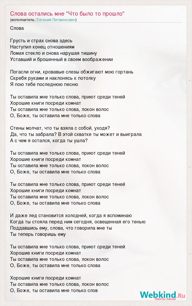 Слова Грусть и страх снова здесь Наступил конец отношениям Ломая стекло и снова нарушая тишину Уставший и брошенный в своем воображении Погасли огни, кровавые слезы обжигают мою гортань Скребя руками и наклонясь к потолку Я пою тебе последнюю песню Ты оставила мне только слова, приют среди теней Хорошие книги посреди комнат Ты оставила мне только слова, локон волос О, Боже, ты оставила мне только слова Стены молчат, что ты взяла с собой, уходя? Да, что ты забрала? В этой схватке ты может и выиграла А с чем я остался, когда ты ушла? Ты оставила мне только слова, приют среди теней Хорошие книги посреди комнат Ты оставила мне только слова, локон волос О, Боже, ты оставила мне только слова Ты оставила мне только слова, приют среди теней Хорошие книги посреди комнат Ты оставила мне только слова, локон волос О, Боже, ты оставила мне только слова И даже лед становится холодней, когда я вспоминаю Когда ты стояла перед ним сегодня, освещенная его тенью Поддавшись ему, слова, что говорила мне ты Ты теперь говоришь ему Ты оставила мне только слова, приют среди теней Хорошие книги посреди комнат Ты оставила мне только слова, локон волос О, Боже, ты оставила мне только слова Хорошие книги посреди комнат Ты оставила мне только слова, локон волос О, Боже, ты оставила мне только слов