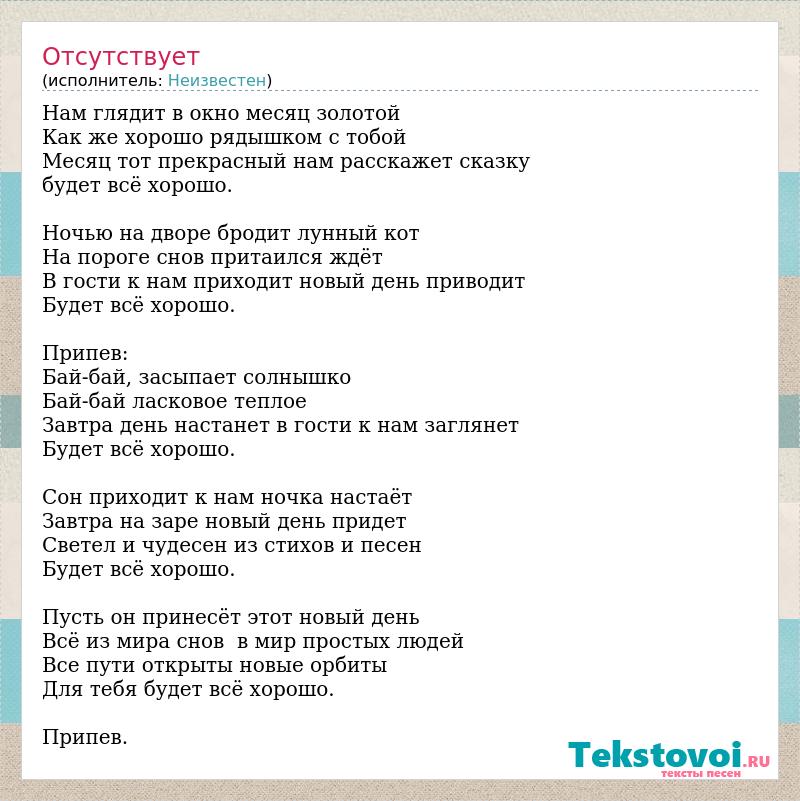 Нам глядит в окно месяц золотой Как же хорошо рядышком с тобой Месяц тот прекрасный нам расскажет сказку будет всё хорошо. Ночью на дворе бродит лунный кот На пороге снов притаился ждёт В гости к нам приходит новый день приводит Будет всё хорошо. Припев: Бай-бай, засыпает солнышко Бай-бай ласковое теплое Завтра день настанет в гости к нам заглянет Будет всё хорошо. Сон приходит к нам ночка настаёт Завтра на заре новый день придет Светел и чудесен из стихов и песен Будет всё хорошо. Пусть он принесёт этот новый день Всё из мира снов в мир простых людей Все пути открыты новые орбиты Для тебя будет всё хорошо. Припев.