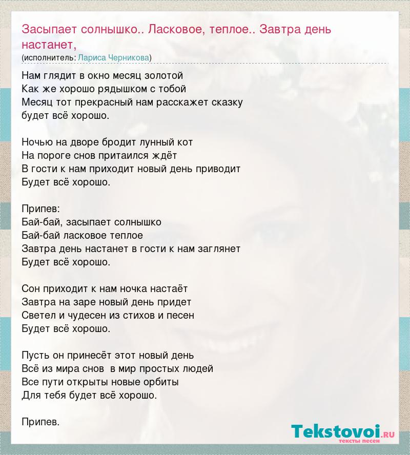 Нам глядит в окно месяц золотой Как же хорошо рядышком с тобой Месяц тот прекрасный нам расскажет сказку будет всё хорошо. Ночью на дворе бродит лунный кот На пороге снов притаился ждёт В гости к нам приходит новый день приводит Будет всё хорошо. Припев: Бай-бай, засыпает солнышко Бай-бай ласковое теплое Завтра день настанет в гости к нам заглянет Будет всё хорошо. Сон приходит к нам ночка настаёт Завтра на заре новый день придет Светел и чудесен из стихов и песен Будет всё хорошо. Пусть он принесёт этот новый день Всё из мира снов в мир простых людей Все пути открыты новые орбиты Для тебя будет всё хорошо. Припев.