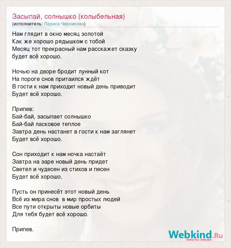 Нам глядит в окно месяц золотой Как же хорошо рядышком с тобой Месяц тот прекрасный нам расскажет сказку будет всё хорошо. Ночью на дворе бродит лунный кот На пороге снов притаился ждёт В гости к нам приходит новый день приводит Будет всё хорошо. Припев: Бай-бай, засыпает солнышко Бай-бай ласковое теплое Завтра день настанет в гости к нам заглянет Будет всё хорошо. Сон приходит к нам ночка настаёт Завтра на заре новый день придет Светел и чудесен из стихов и песен Будет всё хорошо. Пусть он принесёт этот новый день Всё из мира снов в мир простых людей Все пути открыты новые орбиты Для тебя будет всё хорошо. Припев.