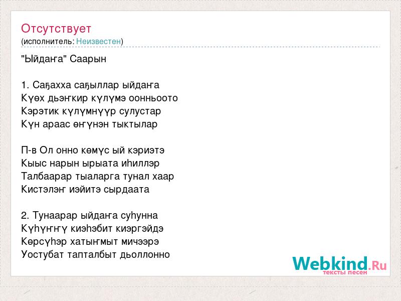 "Ыйдаҥа" Саарын 1. Саҕахха саҕыллар ыйдаҥа Күөх дьэҥкир күлүмэ оонньоото Кэрэтик күлүмнүүр сулустар Күн араас өҥүнэн тыктылар П-в Ол онно көмүс ый кэриэтэ Кыыс нарын ырыата иhиллэр Талбаарар тыаларга тунал хаар Кистэлэҥ иэйитэ сырдаата 2. Тунаарар ыйдаҥа суhунна Күhүҥҥү киэhэбит киэргэйдэ Көрсүhэр хатыҥмыт мичээрэ Уостубат тапталбыт дьоллонно