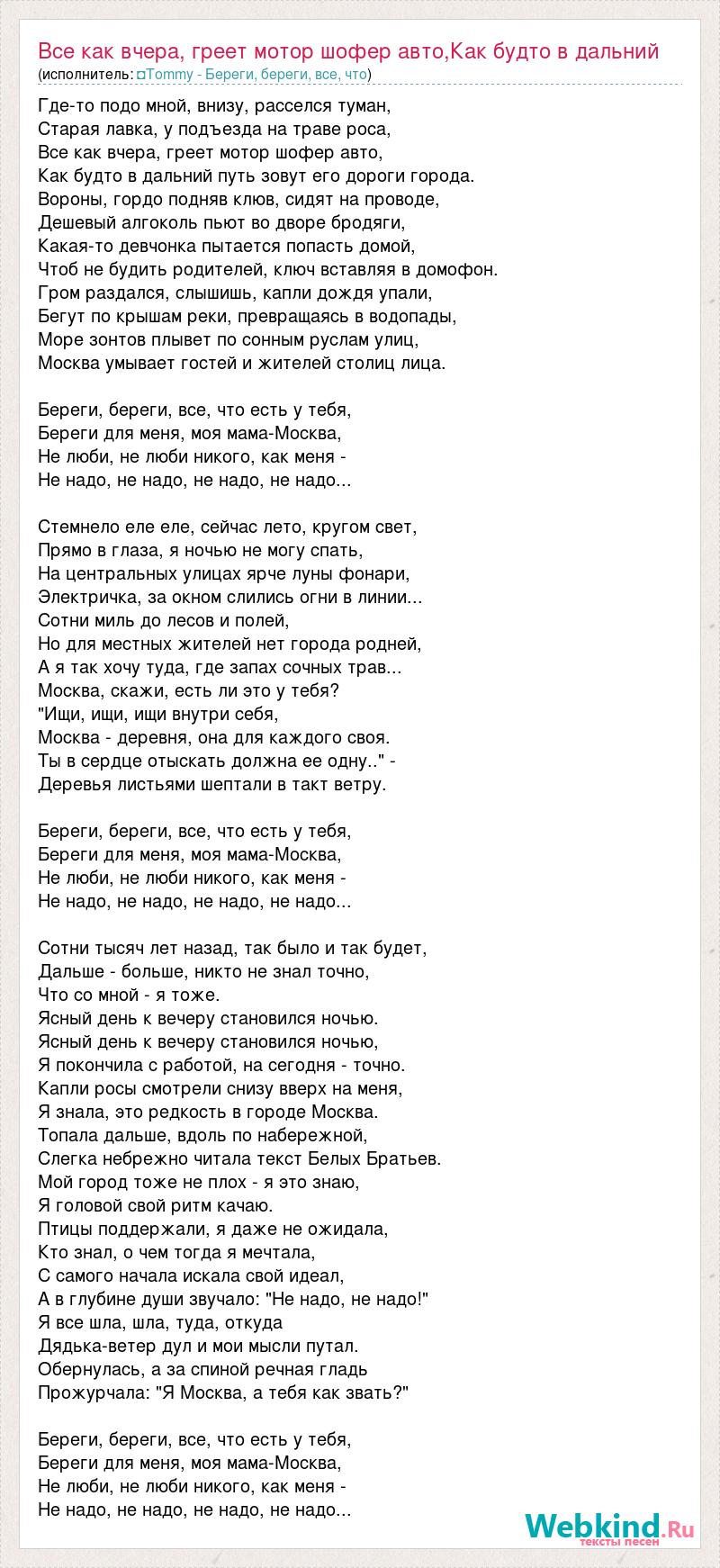 Где-то подо мной, внизу, расселся туман, Старая лавка, у подъезда на траве роса, Все как вчера, греет мотор шофер авто, Как будто в дальний путь зовут его дороги города. Вороны, гордо подняв клюв, сидят на проводе, Дешевый алгоколь пьют во дворе бродяги, Какая-то девчонка пытается попасть домой, Чтоб не будить родителей, ключ вставляя в домофон. Гром раздался, слышишь, капли дождя упали, Бегут по крышам реки, превращаясь в водопады, Море зонтов плывет по сонным руслам улиц, Москва умывает гостей и жителей столиц лица. Береги, береги, все, что есть у тебя, Береги для меня, моя мама-Москва, Не люби, не люби никого, как меня - Не надо, не надо, не надо, не надо... Стемнело еле еле, сейчас лето, кругом свет, Прямо в глаза, я ночью не могу спать, На центральных улицах ярче луны фонари, Электричка, за окном слились огни в линии... Сотни миль до лесов и полей, Но для местных жителей нет города родней, А я так хочу туда, где запах сочных трав... Москва, скажи, есть ли это у тебя? "Ищи, ищи, ищи внутри себя, Москва - деревня, она для каждого своя. Ты в сердце отыскать должна ее одну.." - Деревья листьями шептали в такт ветру. Береги, береги, все, что есть у тебя, Береги для меня, моя мама-Москва, Не люби, не люби никого, как меня - Не надо, не надо, не надо, не надо... Сотни тысяч лет назад, так было и так будет, Дальше - больше, никто не знал точно, Что со мной - я тоже. Ясный день к вечеру становился ночью. Ясный день к вечеру становился ночью, Я покончила с работой, на сегодня - точно. Капли росы смотрели снизу вверх на меня, Я знала, это редкость в городе Москва. Топала дальше, вдоль по набережной, Слегка небрежно читала текст Белых Братьев. Мой город тоже не плох - я это знаю, Я головой свой ритм качаю. Птицы поддержали, я даже не ожидала, Кто знал, о чем тогда я мечтала, С самого начала искала свой идеал, А в глубине души звучало: "Не надо, не надо!" Я все шла, шла, туда, откуда Дядька-ветер дул и мои мысли путал. Обернулась, а за спиной речная гладь Прожурчала: "Я Москва, а тебя как звать?" Береги, береги, все, что есть у тебя, Береги для меня, моя мама-Москва, Не люби, не люби никого, как меня - Не надо, не надо, не надо, не надо...