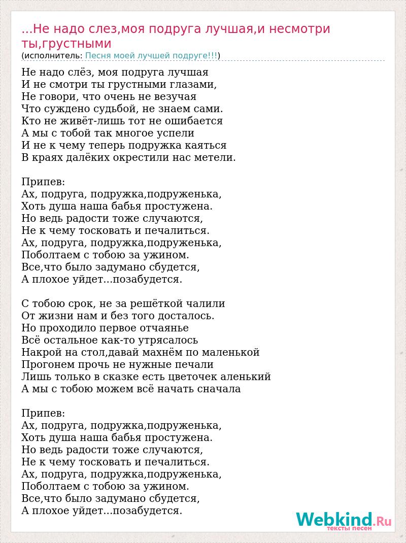 Не надо слёз, моя подруга лучшая И не смотри ты грустными глазами, Не говори, что очень не везучая Что суждено судьбой, не знаем сами. Кто не живёт-лишь тот не ошибается А мы с тобой так многое успели И не к чему теперь подружка каяться В краях далёких окрестили нас метели. Припев: Ах, подруга, подружка,подруженька, Хоть душа наша бабья простужена. Но ведь радости тоже случаются, Не к чему тосковать и печалиться. Ах, подруга, подружка,подруженька, Поболтаем с тобою за ужином. Все,что было задумано сбудется, А плохое уйдет...позабудется. С тобою срок, не за решёткой чалили От жизни нам и без того досталось. Но проходило первое отчаянье Всё остальное как-то утрясалось Накрой на стол,давай махнём по маленькой Прогонем прочь не нужные печали Лишь только в сказке есть цветочек аленький А мы с тобою можем всё начать сначала Припев: Ах, подруга, подружка,подруженька, Хоть душа наша бабья простужена. Но ведь радости тоже случаются, Не к чему тосковать и печалиться. Ах, подруга, подружка,подруженька, Поболтаем с тобою за ужином. Все,что было задумано сбудется, А плохое уйдет...позабудется.