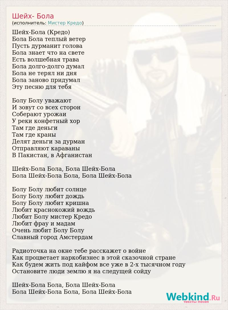 Шейх-Бола (Кредо) Бола Бола теплый ветер Пусть дурманит голова Бола знает что на свете Есть волшебная трава Бола долго-долго думал Бола не терял ни дня Бола заново придумал Эту песню для тебя Болу Болу уважают И зовут со всех сторон Соберают урожаи У реки конфетный хор Там где деньги Там где краны Делят деньги за дурман Отправляют караваны В Пакистан, в Афганистан Шейх-Бола Бола, Бола Шейх-Бола Бола Шейх-Бола Бола, Бола Шейх-Бола Болу Болу любит солнце Болу Болу любит дождь Болу Болу любит кришна Любит краснокожий вождь Любит Болу мистер Кредо Любит фрау и мадам Очень любит Болу Болу Славный город Амстердам Радиоточка на окне тебе расскажет о войне Как процветает наркобизнес в этой сказочной стране Как будем жить под кайфом все уже в 2-х тысячном году Остановите люди землю я на следущей сойду Шейх-Бола Бола, Бола Шейх-Бола Бола Шейх-Бола Бола, Бола Шейх-Бола