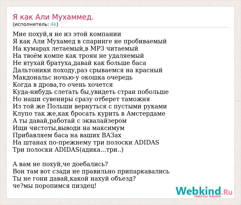 Мне похуй,я не из этой компании Я как Али Мухамед в спаринге не пробиваемый На кумарах летаемый,в MP3 читаемый На твоём компе как троян не удаляемый Не втухай братуха,давай как больше баса Дальтоники походу,раз срываемся на красный Макдональс ночью-у окошка очередь Когда в дрова,то очень хочется Куда-нибудь слетать бы,увидеть стран побольше Но наши сувениры сразу отберет таможня Из той же Польши вернуться с пустыми руками Клупо так же,как бросать курить в Амстердаме А ты давай,работай с эквалайзером Ищи чистоты,выводи на максимум Прибавляем баса на ваших ВАЗах На штанах по-прежнему три полоски ADIDAS Три полоски ADIDAS(адика...три..) А вам не похуй,че доебались? Вон там вот сзади не правильно припаркавались Ты не гони давай,какой нахуй объезд? че?мы поропимся пиздец!