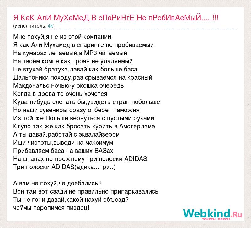 Мне похуй,я не из этой компании Я как Али Мухамед в спаринге не пробиваемый На кумарах летаемый,в MP3 читаемый На твоём компе как троян не удаляемый Не втухай братуха,давай как больше баса Дальтоники походу,раз срываемся на красный Макдональс ночью-у окошка очередь Когда в дрова,то очень хочется Куда-нибудь слетать бы,увидеть стран побольше Но наши сувениры сразу отберет таможня Из той же Польши вернуться с пустыми руками Клупо так же,как бросать курить в Амстердаме А ты давай,работай с эквалайзером Ищи чистоты,выводи на максимум Прибавляем баса на ваших ВАЗах На штанах по-прежнему три полоски ADIDAS Три полоски ADIDAS(адика...три..) А вам не похуй,че доебались? Вон там вот сзади не правильно припаркавались Ты не гони давай,какой нахуй объезд? че?мы поропимся пиздец!