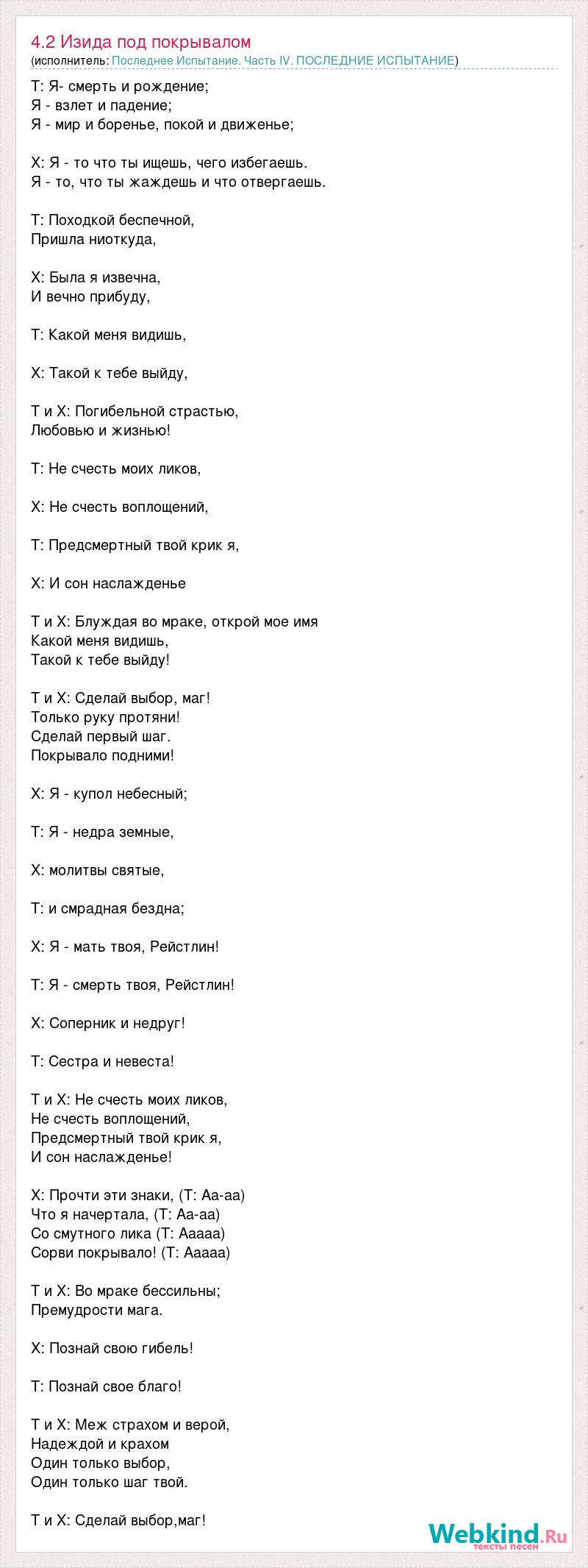 Т: Я- смерть и рождение; Я - взлет и падение; Я - мир и боренье, покой и движенье; Х: Я - то что ты ищешь, чего избегаешь. Я - то, что ты жаждешь и что отвергаешь. Т: Походкой беспечной, Пришла ниоткуда, Х: Была я извечна, И вечно прибуду, Т: Какой меня видишь, Х: Такой к тебе выйду, Т и Х: Погибельной страстью, Любовью и жизнью! Т: Не счесть моих ликов, Х: Не счесть воплощений, Т: Предсмертный твой крик я, Х: И сон наслажденье Т и Х: Блуждая во мраке, открой мое имя Какой меня видишь, Такой к тебе выйду! Т и Х: Сделай выбор, маг! Только руку протяни! Сделай первый шаг. Покрывало подними! Х: Я - купол небесный; Т: Я - недра земные, Х: молитвы святые, Т: и смрадная бездна; Х: Я - мать твоя, Рейстлин! Т: Я - смерть твоя, Рейстлин! Х: Соперник и недруг! Т: Сестра и невеста! Т и Х: Не счесть моих ликов, Не счесть воплощений, Предсмертный твой крик я, И сон наслажденье! Х: Прочти эти знаки, (Т: Аа-аа) Что я начертала, (Т: Аа-аа) Со смутного лика (Т: Ааааа) Сорви покрывало! (Т: Ааааа) Т и Х: Во мраке бессильны; Премудрости мага. Х: Познай свою гибель! Т: Познай свое благо! Т и Х: Меж страхом и верой, Надеждой и крахом Один только выбор, Один только шаг твой. Т и Х: Сделай выбор,маг!