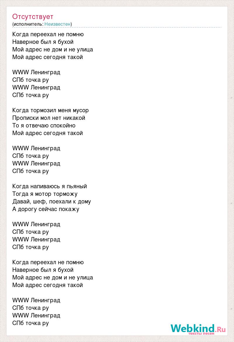Когда переехал не помню Наверное был я бухой Мой адрес не дом и не улица Мой адрес сегодня такой WWW Ленинград СПб точка ру WWW Ленинград СПб точка ру Когда тормозил меня мусор Прописки мол нет никакой То я отвечаю спокойно Мой адрес сегодня такой WWW Ленинград СПб точка ру WWW Ленинград СПб точка ру Когда напиваюсь я пьяный Тогда я мотор торможу Давай, шеф, поехали к дому А дорогу сейчас покажу WWW Ленинград СПб точка ру WWW Ленинград СПб точка ру Когда переехал не помню Наверное был я бухой Мой адрес не дом и не улица Мой адрес сегодня такой WWW Ленинград СПб точка ру WWW Ленинград СПб точка ру