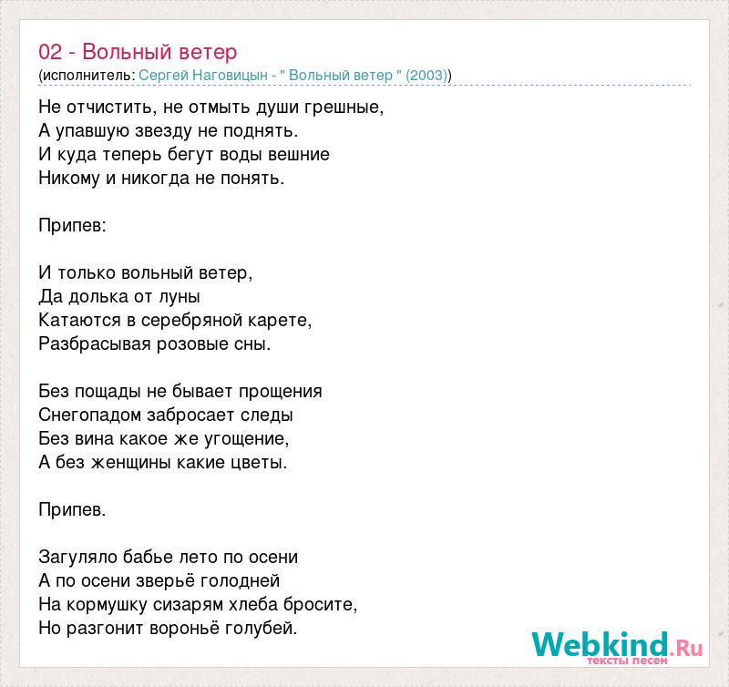 Не отчистить, не отмыть души грешные, А упавшую звезду не поднять. И куда теперь бегут воды вешние Никому и никогда не понять. Припев: И только вольный ветер, Да долька от луны Катаются в серебряной карете, Разбрасывая розовые сны. Без пощады не бывает прощения Снегопадом забросает следы Без вина какое же угощение, А без женщины какие цветы. Припев. Загуляло бабье лето по осени А по осени зверьё голодней На кормушку сизарям хлеба бросите, Но разгонит вороньё голубей.