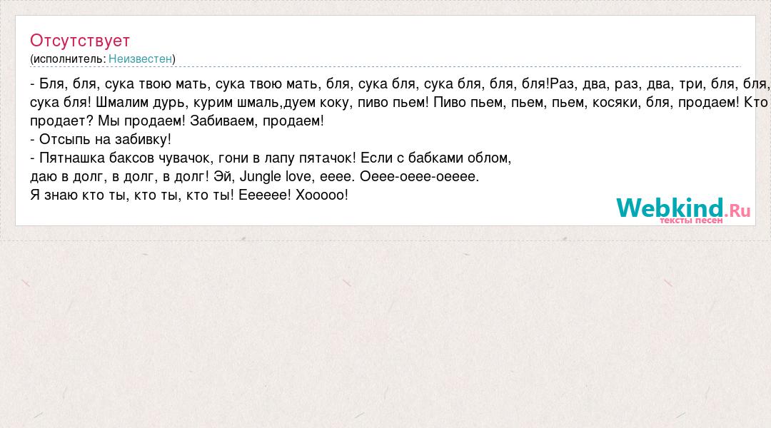 - Бля, бля, сука твою мать, сука твою мать, бля, сука бля, сука бля, бля, бля!Раз, два, раз, два, три, бля, бля, сука бля! Шмалим дурь, курим шмаль,дуем коку, пиво пьем! Пиво пьем, пьем, пьем, косяки, бля, продаем! Кто продает? Мы продаем! Забиваем, продаем! - Отсыпь на забивку! - Пятнашка баксов чувачок, гони в лапу пятачок! Если с бабками облом, даю в долг, в долг, в долг! Эй, Jungle love, ееее. Оеее-оеее-оееее. Я знаю кто ты, кто ты, кто ты! Ееееее! Хооооо!