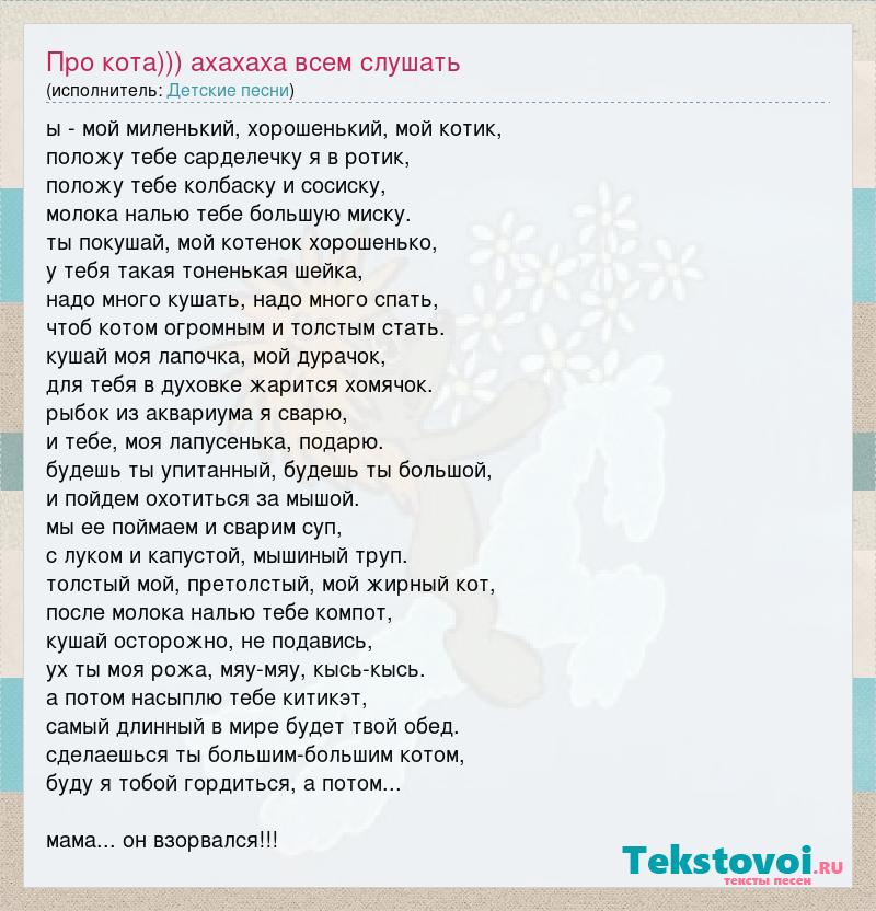 ы - мой миленький, хорошенький, мой котик, положу тебе сарделечку я в ротик, положу тебе колбаску и сосиску, молока налью тебе большую миску. ты покушай, мой котенок хорошенько, у тебя такая тоненькая шейка, надо много кушать, надо много спать, чтоб котом огромным и толстым стать. кушай моя лапочка, мой дурачок, для тебя в духовке жарится хомячок. рыбок из аквариума я сварю, и тебе, моя лапусенька, подарю. будешь ты упитанный, будешь ты большой, и пойдем охотиться за мышой. мы ее поймаем и сварим суп, с луком и капустой, мышиный труп. толстый мой, претолстый, мой жирный кот, после молока налью тебе компот, кушай осторожно, не подавись, ух ты моя рожа, мяу-мяу, кысь-кысь. а потом насыплю тебе китикэт, самый длинный в мире будет твой обед. сделаешься ты большим-большим котом, буду я тобой гордиться, а потом... мама... он взорвался!!!