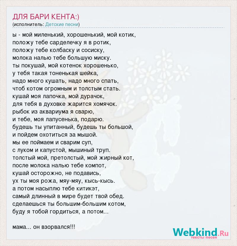 ы - мой миленький, хорошенький, мой котик, положу тебе сарделечку я в ротик, положу тебе колбаску и сосиску, молока налью тебе большую миску. ты покушай, мой котенок хорошенько, у тебя такая тоненькая шейка, надо много кушать, надо много спать, чтоб котом огромным и толстым стать. кушай моя лапочка, мой дурачок, для тебя в духовке жарится хомячок. рыбок из аквариума я сварю, и тебе, моя лапусенька, подарю. будешь ты упитанный, будешь ты большой, и пойдем охотиться за мышой. мы ее поймаем и сварим суп, с луком и капустой, мышиный труп. толстый мой, претолстый, мой жирный кот, после молока налью тебе компот, кушай осторожно, не подавись, ух ты моя рожа, мяу-мяу, кысь-кысь. а потом насыплю тебе китикэт, самый длинный в мире будет твой обед. сделаешься ты большим-большим котом, буду я тобой гордиться, а потом... мама... он взорвался!!!