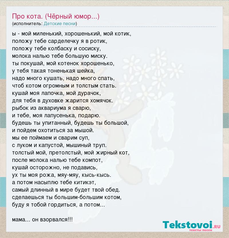 ы - мой миленький, хорошенький, мой котик, положу тебе сарделечку я в ротик, положу тебе колбаску и сосиску, молока налью тебе большую миску. ты покушай, мой котенок хорошенько, у тебя такая тоненькая шейка, надо много кушать, надо много спать, чтоб котом огромным и толстым стать. кушай моя лапочка, мой дурачок, для тебя в духовке жарится хомячок. рыбок из аквариума я сварю, и тебе, моя лапусенька, подарю. будешь ты упитанный, будешь ты большой, и пойдем охотиться за мышой. мы ее поймаем и сварим суп, с луком и капустой, мышиный труп. толстый мой, претолстый, мой жирный кот, после молока налью тебе компот, кушай осторожно, не подавись, ух ты моя рожа, мяу-мяу, кысь-кысь. а потом насыплю тебе китикэт, самый длинный в мире будет твой обед. сделаешься ты большим-большим котом, буду я тобой гордиться, а потом... мама... он взорвался!!!