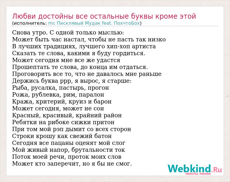 Главная→Исполнители→Mc Писклявый Мудак feat. ПохчтоБох→Любви достойны все остальные буквы кроме этой