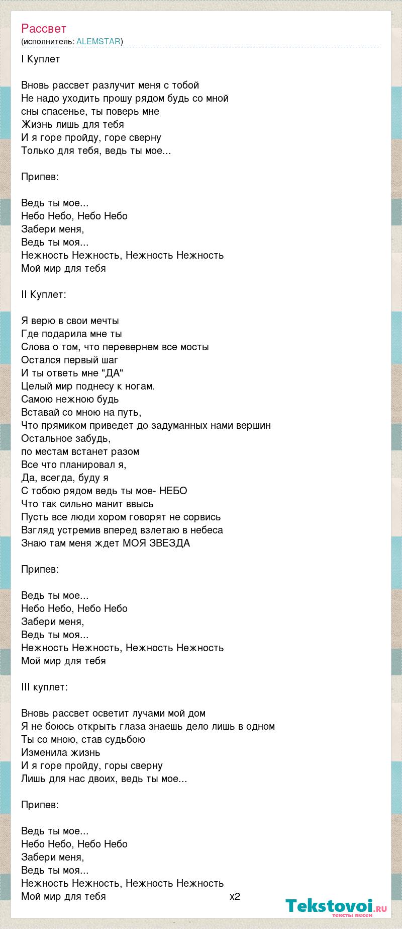 I Куплет Вновь рассвет разлучит меня с тобой Не надо уходить прошу рядом будь со мной сны спасенье, ты поверь мне Жизнь лишь для тебя И я горе пройду, горе сверну Только для тебя, ведь ты мое... Припев: Ведь ты мое... Небо Небо, Небо Небо Забери меня, Ведь ты моя... Нежность Нежность, Нежность Нежность Мой мир для тебя II Куплет: Я верю в свои мечты Где подарила мне ты Слова о том, что перевернем все мосты Остался первый шаг И ты ответь мне "ДА" Целый мир поднесу к ногам. Самою нежною будь Вставай со мною на путь, Что прямиком приведет до задуманных нами вершин Остальное забудь, по местам встанет разом Все что планировал я, Да, всегда, буду я С тобою рядом ведь ты мое- НЕБО Что так сильно манит ввысь Пусть все люди хором говорят не сорвись Взгляд устремив вперед взлетаю в небеса Знаю там меня ждет МОЯ ЗВЕЗДА Припев: Ведь ты мое... Небо Небо, Небо Небо Забери меня, Ведь ты моя... Нежность Нежность, Нежность Нежность Мой мир для тебя III куплет: Вновь рассвет осветит лучами мой дом Я не боюсь открыть глаза знаешь дело лишь в одном Ты со мною, став судьбою Изменила жизнь И я горе пройду, горы сверну Лишь для нас двоих, ведь ты мое... Припев: Ведь ты мое... Небо Небо, Небо Небо Забери меня, Ведь ты моя... Нежность Нежность, Нежность Нежность Мой мир для тебя x2