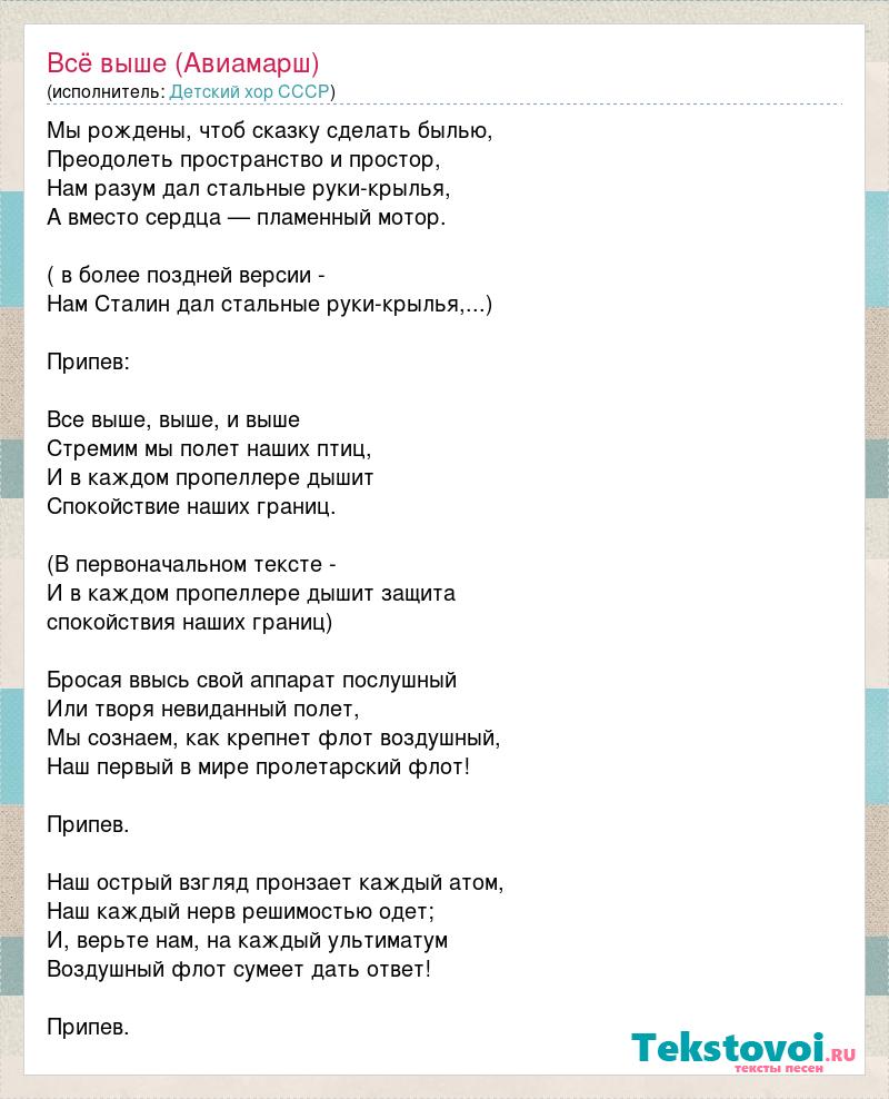 Мы рождены, чтоб сказку сделать былью, Преодолеть пространство и простор, Нам разум дал стальные руки-крылья, А вместо сердца — пламенный мотор. ( в более поздней версии - Нам Сталин дал стальные руки-крылья,...) Припев: Все выше, выше, и выше Стремим мы полет наших птиц, И в каждом пропеллере дышит Спокойствие наших границ. (В первоначальном тексте - И в каждом пропеллере дышит защита спокойствия наших границ) Бросая ввысь свой аппарат послушный Или творя невиданный полет, Мы сознаем, как крепнет флот воздушный, Наш первый в мире пролетарский флот! Припев. Наш острый взгляд пронзает каждый атом, Наш каждый нерв решимостью одет; И, верьте нам, на каждый ультиматум Воздушный флот сумеет дать ответ! Припев.