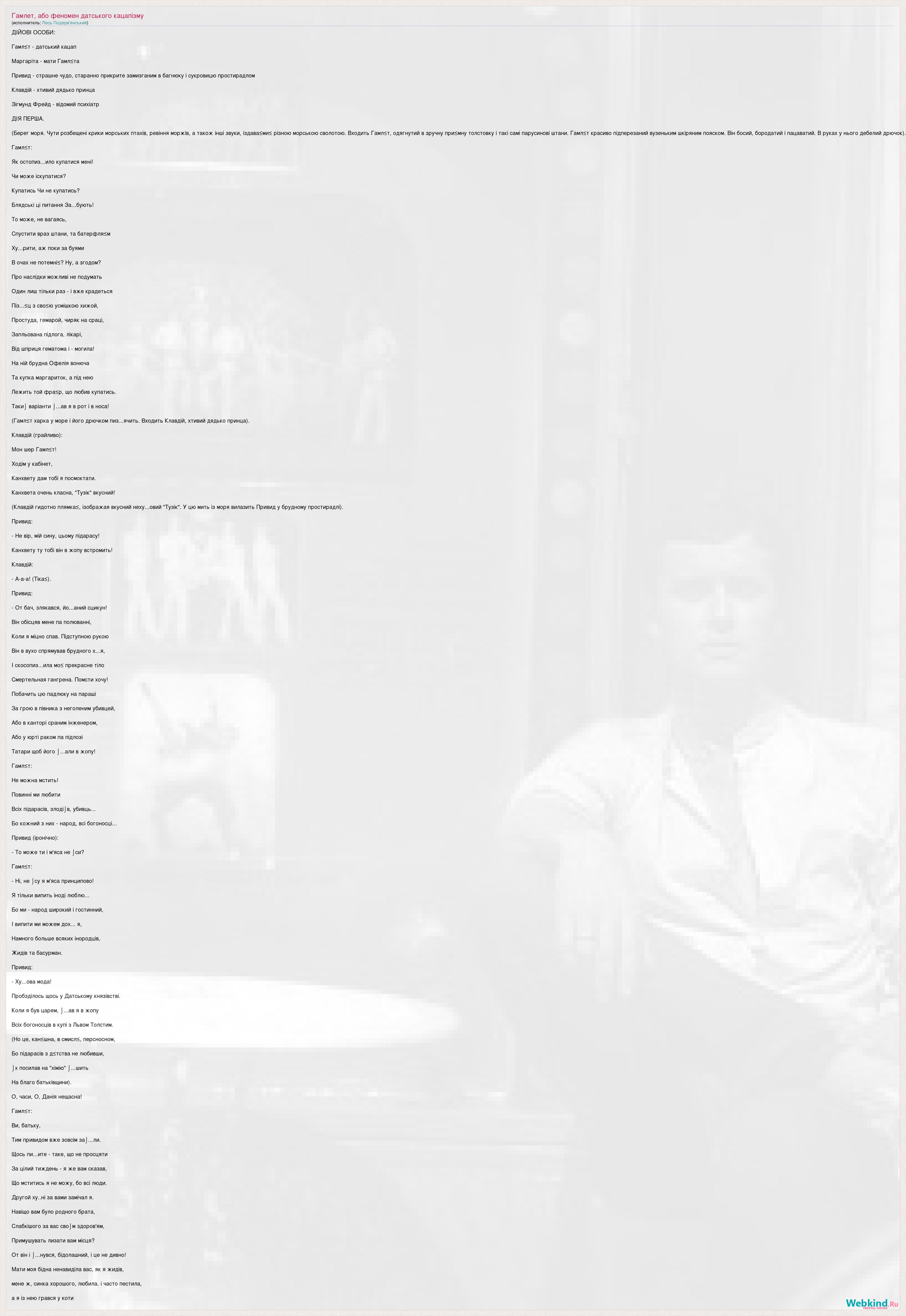 ДIЙОВI ОСОБИ: Гамл≤т - датський кацап Маргарiта - мати Гамл≤та Привид - страшне чудо, старанно прикрите замизганим в багнюку i сукровицю простирадлом Клавдiй - хтивий дядько принца Зiгмунд Фрейд - вiдомий психiатр ДIЯ ПЕРША. (Берег моря. Чути розбещенi крики морських птахiв, ревiння моржiв, а також iншi звуки, iздава≤ми≤ рiзною морською сволотою. Входить Гамл≤т, одягнутий в зручну при≤мну толстовку i такi самi парусиновi штани. Гамл≤т красиво пiдперезаний вузеньким шкiряним пояском. Вiн босий, бородатий i пацаватий. В руках у нього дебелий дрючок). Гамл≤т: Як остопиз...ило купатися менi! Чи може iскупатися? Купатись Чи не купатись? Блядськi цi питання За...бують! То може, не вагаясь, Спустити враз штани, та батерфля≤м Ху...рити, аж поки за буями В очах не потемнi≤? Ну, а згодом? Про наслiдки можливi не подумать Один лиш тiльки раз - i вже крадеться Пiз...≤ц з сво≤ю усмiшкою хижой, Простуда, гемарой, чиряк на срацi, Запльована пiдлога, лiкарi, Вiд шприця гематома i - могила! На нiй брудна Офелiя вонюча Та купка маргариток, а пiд нею Лежить той фра≤р, що любив купатись. Таки⌡ варiанти ⌡...ав я в рот i в носа! (Гамл≤т харка у море i його дрючком пиз...ячить. Входить Клавдiй, хтивий дядько принца). Клавдiй (грайливо): Мон шер Гамл≤т! Ходiм у кабiнет, Канхвету дам тобi я посмоктати. Канхвета очень класна, "Тузiк" вкусний! (Клавдiй гидотно плямка≤, iзображая вкусний неху...овий "Тузiк". У цю мить iз моря вилазить Привид у брудному простирадлi). Привид: - Не вiр, мiй сину, цьому пiдарасу! Канхвету ту тобi вiн в жопу встромить! Клавдiй: - А-а-а! (Тiка≤). Привид: - От бач, злякався, йо...аний сцикун! Вiн обiсцяв мене па полюваннi, Коли я мiцно спав. Пiдступною рукою Вiн в вухо спрямував брудного х...я, I скосопиз...ила мо≤ прекрасне тiло Смертельная гангрена. Помсти хочу! Побачить цю падлюку на парашi За грою в пiвника з неголеним убивцей, Або в канторi сраним iнженером, Або у юртi раком па пiдлозi Татари щоб його ⌡...али в жопу! Гамл≤т: Не можна мстить! Повиннi ми любити Всiх пiдарасiв, злодi⌡в, убивць... Бо кожний з них - народ, всi богоносцi... Привид (iронiчно): - То може ти i м'яса не ⌡си? Гамл≤т: - Нi, не ⌡су я м'яса принципово! Я тiльки випить iнодi люблю... Бо ми - народ широкий i гостинний, I випити ми можем дох... я, Намного больше всяких iнородцiв, Жидiв та басурман. Привид: - Ху...ова мода! Пробздiлось щось у Датському князiвствi. Коли я був царем, ⌡...ав я в жопу Всiх богоносцiв в купi з Львом Толстим. (Но це, кан≤шна, в смисл≤, персносном, Бо пiдарасiв з д≤тства не любивши, ⌡х посилав на "хiмiю" ⌡...шить На благо батькiвщини). О, часи, О, Данiя нещасна! Гамл≤т: Ви, батьку, Тим привидом вже зовсiм за⌡...ли. Щось пи...ите - таке, що не просцяти За цiлий тиждень - я же вам сказав, Що мститись я не можу, бо всi люди. Другой ху..нi за вами замiчал я. Навiщо вам було родного брата, Слабкiшого за вас сво⌡м здоров'ям, Примушувать лизати вам мiсця? От вiн i ⌡...нувся, бiдолашний, i це не дивно! Мати моя бiдна ненавидiла вас, як я жидiв, мене ж, синка хорошого, любила. i часто пестила, а я iз нею грався у коти