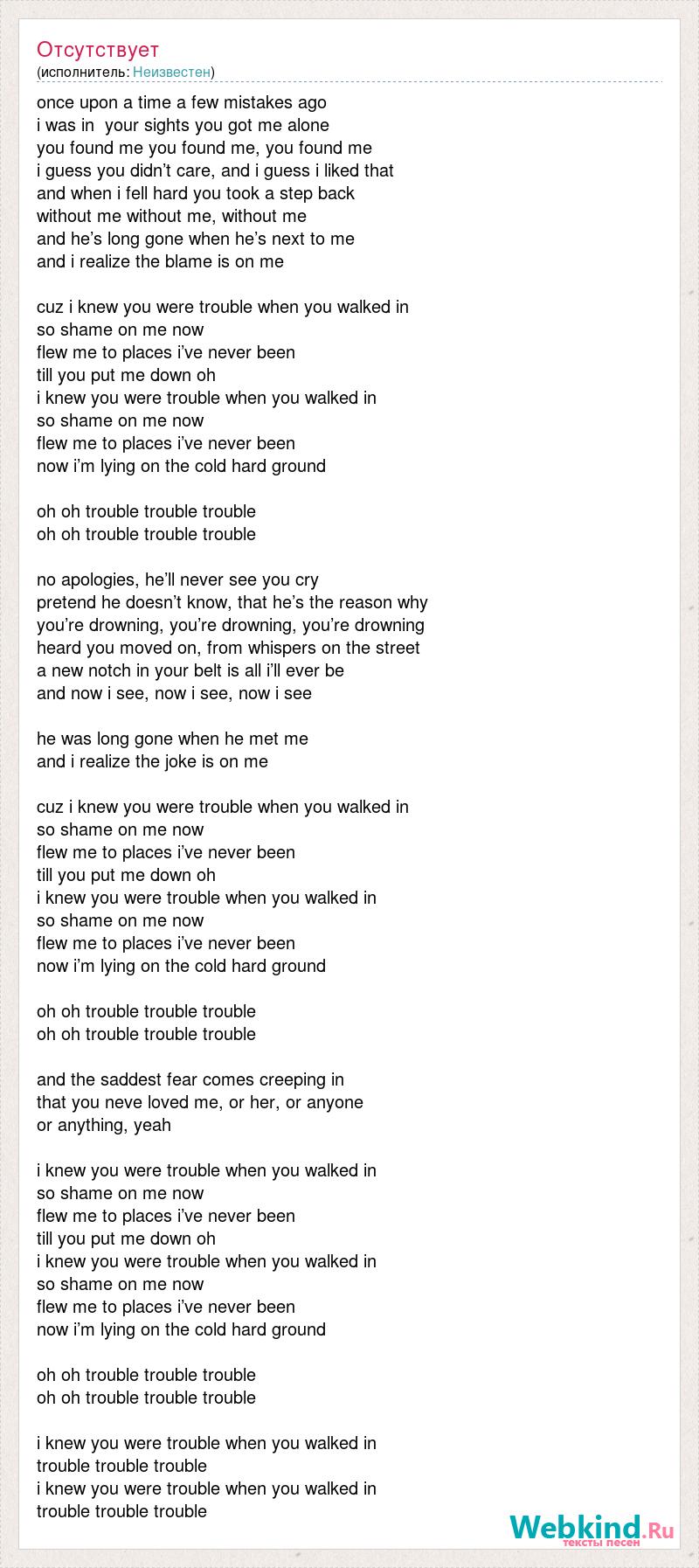 once upon a time a few mistakes ago i was in your sights you got me alone you found me you found me, you found me i guess you didn’t care, and i guess i liked that and when i fell hard you took a step back without me without me, without me and he’s long gone when he’s next to me and i realize the blame is on me cuz i knew you were trouble when you walked in so shame on me now flew me to places i’ve never been till you put me down oh i knew you were trouble when you walked in so shame on me now flew me to places i’ve never been now i’m lying on the cold hard ground oh oh trouble trouble trouble oh oh trouble trouble trouble no apologies, he’ll never see you cry pretend he doesn’t know, that he’s the reason why you’re drowning, you’re drowning, you’re drowning heard you moved on, from whispers on the street a new notch in your belt is all i’ll ever be and now i see, now i see, now i see he was long gone when he met me and i realize the joke is on me cuz i knew you were trouble when you walked in so shame on me now flew me to places i’ve never been till you put me down oh i knew you were trouble when you walked in so shame on me now flew me to places i’ve never been now i’m lying on the cold hard ground oh oh trouble trouble trouble oh oh trouble trouble trouble and the saddest fear comes creeping in that you neve loved me, or her, or anyone or anything, yeah i knew you were trouble when you walked in so shame on me now flew me to places i’ve never been till you put me down oh i knew you were trouble when you walked in so shame on me now flew me to places i’ve never been now i’m lying on the cold hard ground oh oh trouble trouble trouble oh oh trouble trouble trouble i knew you were trouble when you walked in trouble trouble trouble i knew you were trouble when you walked in trouble trouble trouble