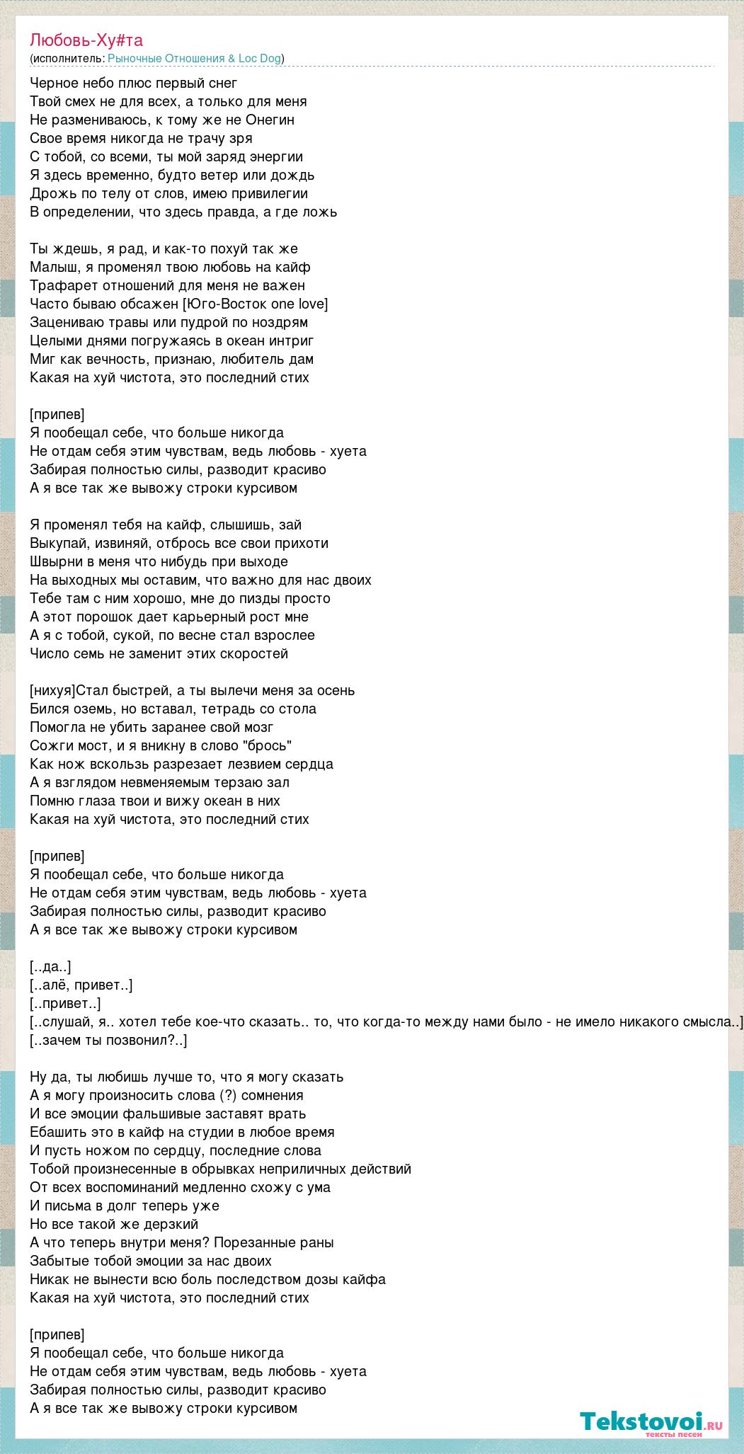 Черное небо плюс первый снег Твой смех не для всех, а только для меня Не размениваюсь, к тому же не Онегин Свое время никогда не трачу зря С тобой, со всеми, ты мой заряд энергии Я здесь временно, будто ветер или дождь Дрожь по телу от слов, имею привилегии В определении, что здесь правда, а где ложь Ты ждешь, я рад, и как-то похуй так же Малыш, я променял твою любовь на кайф Трафарет отношений для меня не важен Часто бываю обсажен [Юго-Восток one love] Зацениваю травы или пудрой по ноздрям Целыми днями погружаясь в океан интриг Миг как вечность, признаю, любитель дам Какая на хуй чистота, это последний стих [припев] Я пообещал себе, что больше никогда Не отдам себя этим чувствам, ведь любовь - хуета Забирая полностью силы, разводит красиво А я все так же вывожу строки курсивом Я променял тебя на кайф, слышишь, зай Выкупай, извиняй, отбрось все свои прихоти Швырни в меня что нибудь при выходе На выходных мы оставим, что важно для нас двоих Тебе там с ним хорошо, мне до пизды просто А этот порошок дает карьерный рост мне А я с тобой, сукой, по весне стал взрослее Число семь не заменит этих скоростей [нихуя]Стал быстрей, а ты вылечи меня за осень Бился оземь, но вставал, тетрадь со стола Помогла не убить заранее свой мозг Сожги мост, и я вникну в слово "брось" Как нож вскользь разрезает лезвием сердца А я взглядом невменяемым терзаю зал Помню глаза твои и вижу океан в них Какая на хуй чистота, это последний стих [припев] Я пообещал себе, что больше никогда Не отдам себя этим чувствам, ведь любовь - хуета Забирая полностью силы, разводит красиво А я все так же вывожу строки курсивом [..да..] [..алё, привет..] [..привет..] [..слушай, я.. хотел тебе кое-что сказать.. то, что когда-то между нами было - не имело никакого смысла..] [..зачем ты позвонил?..] Ну да, ты любишь лучше то, что я могу сказать А я могу произносить слова (?) сомнения И все эмоции фальшивые заставят врать Ебашить это в кайф на студии в любое время И пусть ножом по сердцу, последние слова Тобой произнесенные в обрывках неприличных действий От всех воспоминаний медленно схожу с ума И письма в долг теперь уже Но все такой же дерзкий А что теперь внутри меня? Порезанные раны Забытые тобой эмоции за нас двоих Никак не вынести всю боль последством дозы кайфа Какая на хуй чистота, это последний стих [припев] Я пообещал себе, что больше никогда Не отдам себя этим чувствам, ведь любовь - хуета Забирая полностью силы, разводит красиво А я все так же вывожу строки курсивом