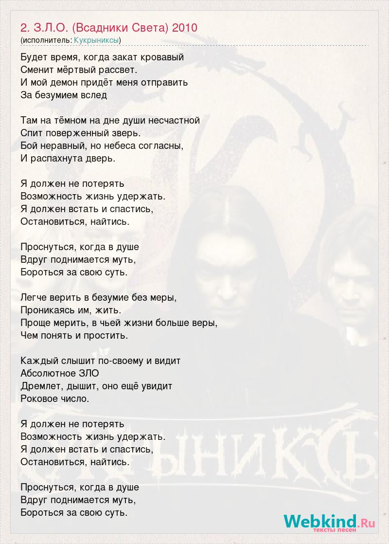 Будет время, когда закат кровавый Сменит мёртвый рассвет. И мой демон придёт меня отправить За безумием вслед Там на тёмном на дне души несчастной Спит поверженный зверь. Бой неравный, но небеса согласны, И распахнута дверь. Я должен не потерять Возможность жизнь удержать. Я должен встать и спастись, Остановиться, найтись. Проснуться, когда в душе Вдруг поднимается муть, Бороться за свою суть. Легче верить в безумие без меры, Проникаясь им, жить. Проще мерить, в чьей жизни больше веры, Чем понять и простить. Каждый слышит по-своему и видит Абсолютное ЗЛО Дремлет, дышит, оно ещё увидит Роковое число. Я должен не потерять Возможность жизнь удержать. Я должен встать и спастись, Остановиться, найтись. Проснуться, когда в душе Вдруг поднимается муть, Бороться за свою суть.