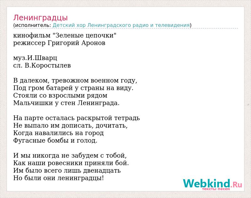 кинофильм "Зеленые цепочки" режиссер Григорий Аронов муз.И.Шварц сл. В.Коростылев В далеком, тревожном военном году, Под гром батарей у страны на виду. Стояли со взрослыми рядом Мальчишки у стен Ленинграда. На парте осталась раскрытой тетрадь Не выпало им дописать, дочитать, Когда навалились на город Фугасные бомбы и голод. И мы никогда не забудем с тобой, Как наши ровесники приняли бой. Им было всего лишь двенадцать Но были они ленинградцы!