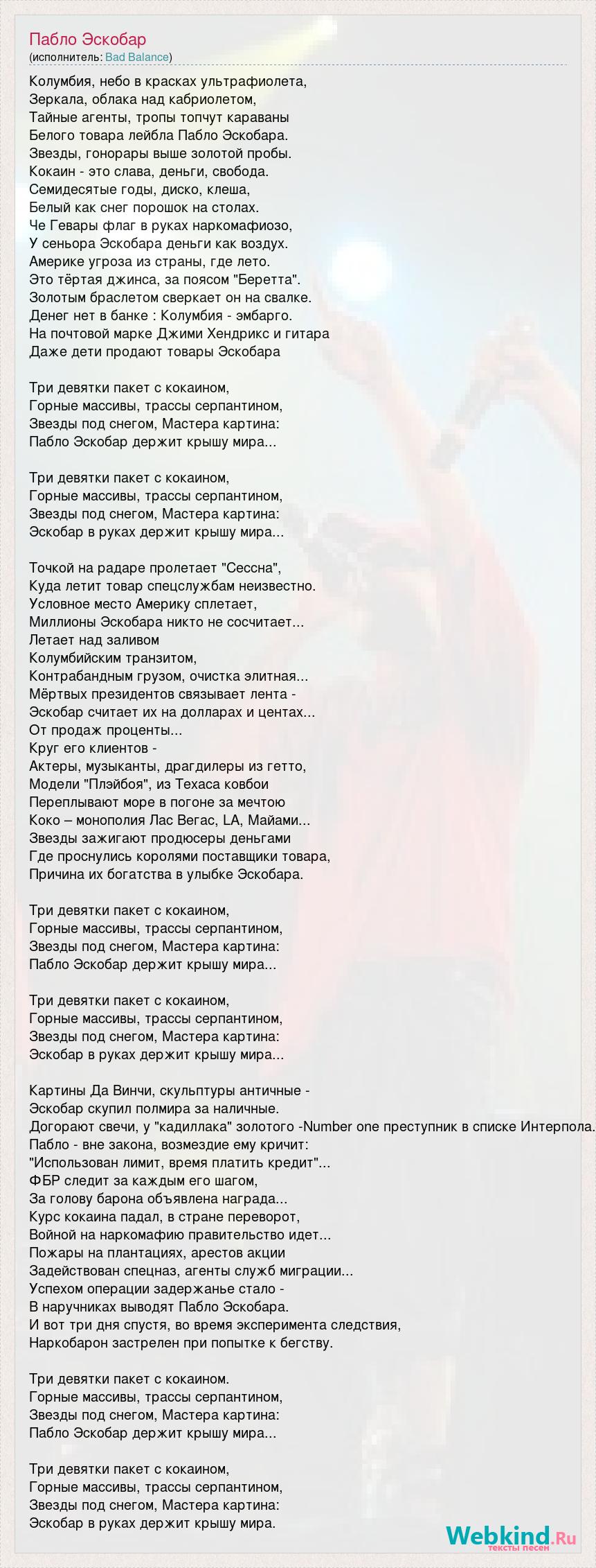 Колумбия, небо в красках ультрафиолета, Зеркала, облака над кабриолетом, Тайные агенты, тропы топчут караваны Белого товара лейбла Пабло Эскобара. Звезды, гонорары выше золотой пробы. Кокаин - это слава, деньги, свобода. Семидесятые годы, диско, клеша, Белый как снег порошок на столах. Че Гевары флаг в руках наркомафиозо, У сеньора Эскобара деньги как воздух. Америке угроза из страны, где лето. Это тёртая джинса, за поясом "Беретта". Золотым браслетом сверкает он на свалке. Денег нет в банке : Колумбия - эмбарго. На почтовой марке Джими Хендрикс и гитара Даже дети продают товары Эскобара Три девятки пакет с кокаином, Горные массивы, трассы серпантином, Звезды под снегом, Мастера картина: Пабло Эскобар держит крышу мира... Три девятки пакет с кокаином, Горные массивы, трассы серпантином, Звезды под снегом, Мастера картина: Эскобар в руках держит крышу мира... Точкой на радаре пролетает "Сессна", Куда летит товар спецслужбам неизвестно. Условное место Америку сплетает, Миллионы Эскобара никто не сосчитает... Летает над заливом Колумбийским транзитом, Контрабандным грузом, очистка элитная... Мёртвых президентов связывает лента - Эскобар считает их на долларах и центах... От продаж проценты... Круг его клиентов - Актеры, музыканты, драгдилеры из гетто, Модели "Плэйбоя", из Техаса ковбои Переплывают море в погоне за мечтою Коко – монополия Лас Вегас, LA, Майами... Звезды зажигают продюсеры деньгами Где проснулись королями поставщики товара, Причина их богатства в улыбке Эскобара. Три девятки пакет с кокаином, Горные массивы, трассы серпантином, Звезды под снегом, Мастера картина: Пабло Эскобар держит крышу мира... Три девятки пакет с кокаином, Горные массивы, трассы серпантином, Звезды под снегом, Мастера картина: Эскобар в руках держит крышу мира... Картины Да Винчи, скульптуры античные - Эскобар скупил полмира за наличные. Догорают свечи, у "кадиллака" золотого -Number one преступник в списке Интерпола. Пабло - вне закона, возмездие ему кричит: "Использован лимит, время платить кредит"... ФБР следит за каждым его шагом, За голову барона объявлена награда... Курс кокаина падал, в стране переворот, Войной на наркомафию правительство идет... Пожары на плантациях, арестов акции Задействован спецназ, агенты служб миграции... Успехом операции задержанье стало - В наручниках выводят Пабло Эскобара. И вот три дня спустя, во время эксперимента следствия, Наркобарон застрелен при попытке к бегству. Три девятки пакет с кокаином. Горные массивы, трассы серпантином, Звезды под снегом, Мастера картина: Пабло Эскобар держит крышу мира... Три девятки пакет с кокаином, Горные массивы, трассы серпантином, Звезды под снегом, Мастера картина: Эскобар в руках держит крышу мира.