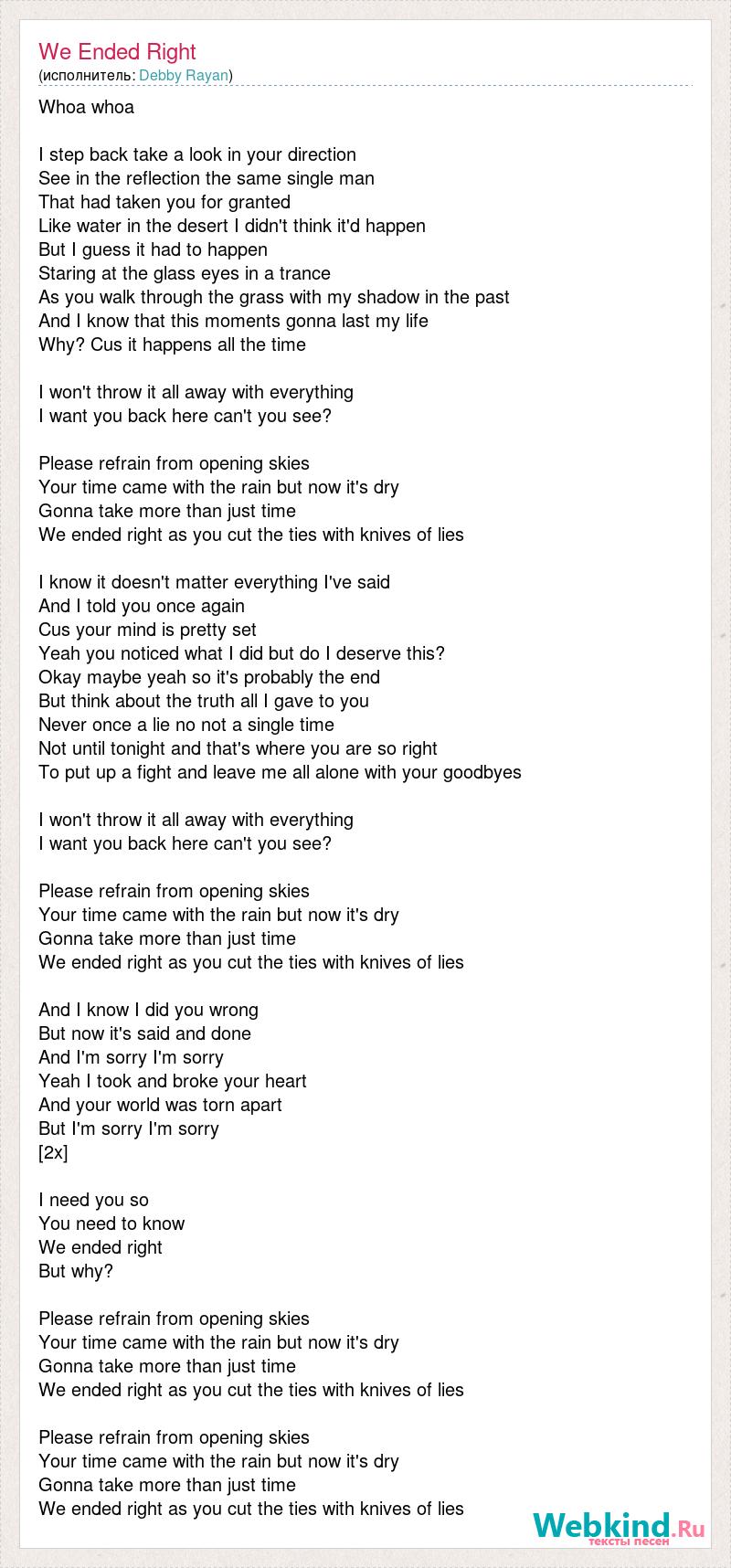 Whoa whoa I step back take a look in your direction See in the reflection the same single man That had taken you for granted Like water in the desert I didn't think it'd happen But I guess it had to happen Staring at the glass eyes in a trance As you walk through the grass with my shadow in the past And I know that this moments gonna last my life Why? Cus it happens all the time I won't throw it all away with everything I want you back here can't you see? Please refrain from opening skies Your time came with the rain but now it's dry Gonna take more than just time We ended right as you cut the ties with knives of lies I know it doesn't matter everything I've said And I told you once again Cus your mind is pretty set Yeah you noticed what I did but do I deserve this? Okay maybe yeah so it's probably the end But think about the truth all I gave to you Never once a lie no not a single time Not until tonight and that's where you are so right To put up a fight and leave me all alone with your goodbyes I won't throw it all away with everything I want you back here can't you see? Please refrain from opening skies Your time came with the rain but now it's dry Gonna take more than just time We ended right as you cut the ties with knives of lies And I know I did you wrong But now it's said and done And I'm sorry I'm sorry Yeah I took and broke your heart And your world was torn apart But I'm sorry I'm sorry [2x] I need you so You need to know We ended right But why? Please refrain from opening skies Your time came with the rain but now it's dry Gonna take more than just time We ended right as you cut the ties with knives of lies Please refrain from opening skies Your time came with the rain but now it's dry Gonna take more than just time We ended right as you cut the ties with knives of lies