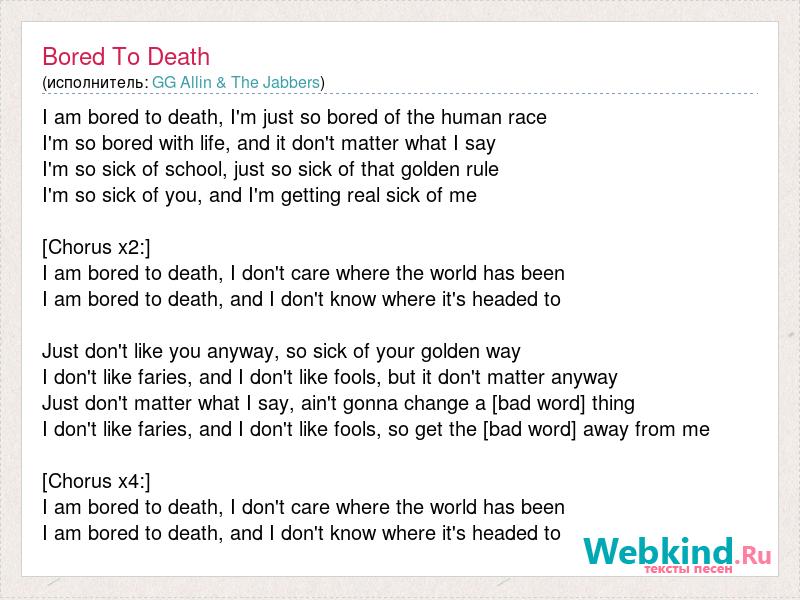 I am bored to death, I'm just so bored of the human race I'm so bored with life, and it don't matter what I say I'm so sick of school, just so sick of that golden rule I'm so sick of you, and I'm getting real sick of me [Chorus x2:] I am bored to death, I don't care where the world has been I am bored to death, and I don't know where it's headed to Just don't like you anyway, so sick of your golden way I don't like faries, and I don't like fools, but it don't matter anyway Just don't matter what I say, ain't gonna change a [bad word] thing I don't like faries, and I don't like fools, so get the [bad word] away from me [Chorus x4:] I am bored to death, I don't care where the world has been I am bored to death, and I don't know where it's headed to