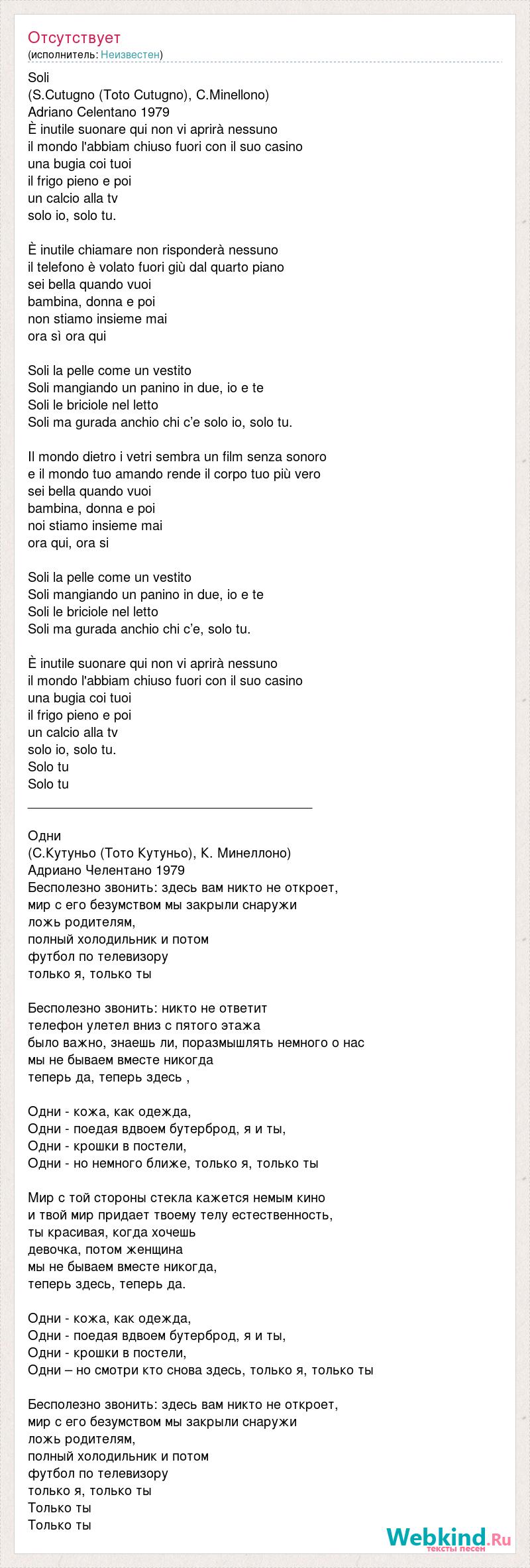 Soli (S.Cutugno (Toto Cutugno), C.Minellono) Adriano Celentano 1979 È inutile suonare qui non vi aprirà nessuno il mondo l'abbiam chiuso fuori con il suo casino una bugia coi tuoi il frigo pieno e poi un calcio alla tv solo io, solo tu. È inutile chiamare non risponderà nessuno il telefono è volato fuori giù dal quarto piano sei bella quando vuoi bambina, donna e poi non stiamo insieme mai ora sì ora qui Soli la pelle come un vestito Soli mangiando un panino in due, io e te Soli le briciole nel letto Soli ma gurada anchio chi c’e solo io, solo tu. Il mondo dietro i vetri sembra un film senza sonoro e il mondo tuo amando rende il corpo tuo più vero sei bella quando vuoi bambina, donna e poi noi stiamo insieme mai ora qui, ora si Soli la pelle come un vestito Soli mangiando un panino in due, io e te Soli le briciole nel letto Soli ma gurada anchio chi c’e, solo tu. È inutile suonare qui non vi aprirà nessuno il mondo l'abbiam chiuso fuori con il suo casino una bugia coi tuoi il frigo pieno e poi un calcio alla tv solo io, solo tu. Solo tu Solo tu _______________________________________ Одни (С.Кутуньо (Тото Кутуньо), К. Минеллоно) Адриано Челентано 1979 Бесполезно звонить: здесь вам никто не откроет, мир с его безумством мы закрыли снаружи ложь родителям, полный холодильник и потом футбол по телевизору только я, только ты Бесполезно звонить: никто не ответит телефон улетел вниз с пятого этажа было важно, знаешь ли, поразмышлять немного о нас мы не бываем вместе никогда теперь да, теперь здесь , Одни - кожа, как одежда, Одни - поедая вдвоем бутерброд, я и ты, Одни - крошки в постели, Одни - но немного ближе, только я, только ты Мир с той стороны стекла кажется немым кино и твой мир придает твоему телу естественность, ты красивая, когда хочешь девочка, потом женщина мы не бываем вместе никогда, теперь здесь, теперь да. Одни - кожа, как одежда, Одни - поедая вдвоем бутерброд, я и ты, Одни - крошки в постели, Одни – но смотри кто снова здесь, только я, только ты Бесполезно звонить: здесь вам никто не откроет, мир с его безумством мы закрыли снаружи ложь родителям, полный холодильник и потом футбол по телевизору только я, только ты Только ты Только ты
