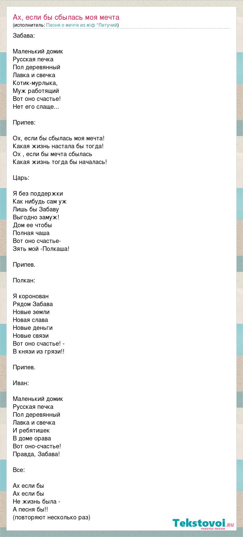 Забава: Маленький домик Русская печка Пол деревянный Лавка и свечка Котик-мурлыка, Муж работящий Вот оно счастье! Нет его слаще... Припев: Ох, если бы сбылась моя мечта! Какая жизнь настала бы тогда! Ох , если бы мечта сбылась Какая жизнь тогда бы началась! Царь: Я без поддержки Как нибудь сам уж Лишь бы Забаву Выгодно замуж! Дом ее чтобы Полная чаша Вот оно счастье- Зять мой -Полкаша! Припев. Полкан: Я коронован Рядом Забава Новые земли Новая слава Новые деньги Новые связи Вот оно счастье! - В князи из грязи!! Припев. Иван: Маленький домик Русская печка Пол деревянный Лавка и свечка И ребятишек В доме орава Вот оно-счастье! Правда, Забава! Все: Ах если бы Ах если бы Не жизнь была - А песня бы!! (повторяют несколько раз)