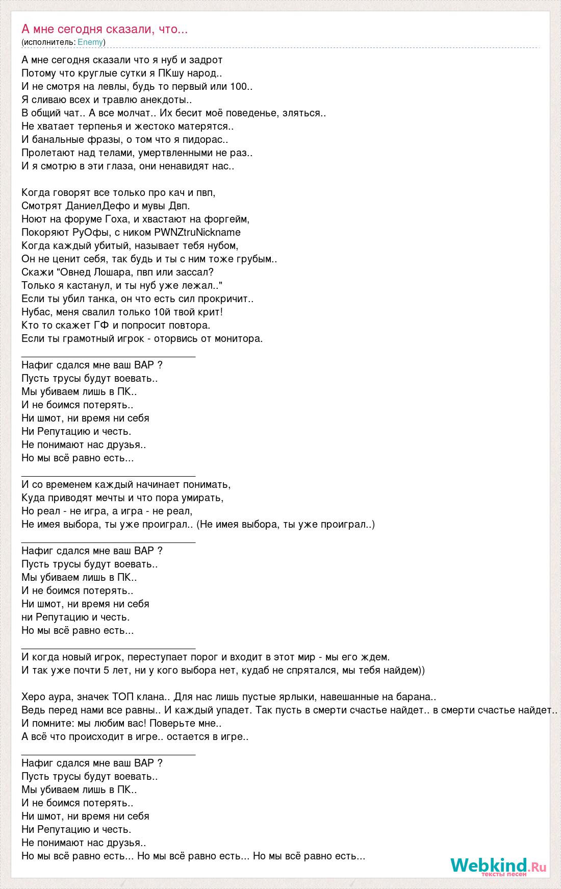 А мне сегодня сказали что я нуб и задрот Потому что круглые сутки я ПКшу народ.. И не смотря на левлы, будь то первый или 100.. Я сливаю всех и травлю анекдоты.. В общий чат.. А все молчат.. Их бесит моё поведенье, зляться.. Не хватает терпенья и жестоко матерятся.. И банальные фразы, о том что я пидорас.. Пролетают над телами, умертвленными не раз.. И я смотрю в эти глаза, они ненавидят нас.. Когда говорят все только про кач и пвп, Смотрят ДаниелДефо и мувы Двп. Ноют на форуме Гоха, и хвастают на форгейм, Покоряют РуОфы, с ником PWNZtruNickname Когда каждый убитый, называет тебя нубом, Он не ценит себя, так будь и ты с ним тоже грубым.. Скажи "Овнед Лошара, пвп или зассал? Только я кастанул, и ты нуб уже лежал.." Если ты убил танка, он что есть сил прокричит.. Нубас, меня свалил только 10й твой крит! Кто то скажет ГФ и попросит повтора. Если ты грамотный игрок - оторвись от монитора. _______________________________ Нафиг сдался мне ваш ВАР ? Пусть трусы будут воевать.. Мы убиваем лишь в ПК.. И не боимся потерять.. Ни шмот, ни время ни себя Ни Репутацию и честь. Не понимают нас друзья.. Но мы всё равно есть... _______________________________ И со временем каждый начинает понимать, Куда приводят мечты и что пора умирать, Но реал - не игра, а игра - не реал, Не имея выбора, ты уже проиграл.. (Не имея выбора, ты уже проиграл..) _______________________________ Нафиг сдался мне ваш ВАР ? Пусть трусы будут воевать.. Мы убиваем лишь в ПК.. И не боимся потерять.. Ни шмот, ни время ни себя ни Репутацию и честь. Но мы всё равно есть... _______________________________ И когда новый игрок, переступает порог и входит в этот мир - мы его ждем. И так уже почти 5 лет, ни у кого выбора нет, кудаб не спрятался, мы тебя найдем)) Херо аура, значек ТОП клана.. Для нас лишь пустые ярлыки, навешанные на барана.. Ведь перед нами все равны.. И каждый упадет. Так пусть в смерти счастье найдет.. в смерти счастье найдет.. И помните: мы любим вас! Поверьте мне.. А всё что происходит в игре.. остается в игре.. _______________________________ Нафиг сдался мне ваш ВАР ? Пусть трусы будут воевать.. Мы убиваем лишь в ПК.. И не боимся потерять.. Ни шмот, ни время ни себя Ни Репутацию и честь. Не понимают нас друзья.. Но мы всё равно есть... Но мы всё равно есть... Но мы всё равно есть...