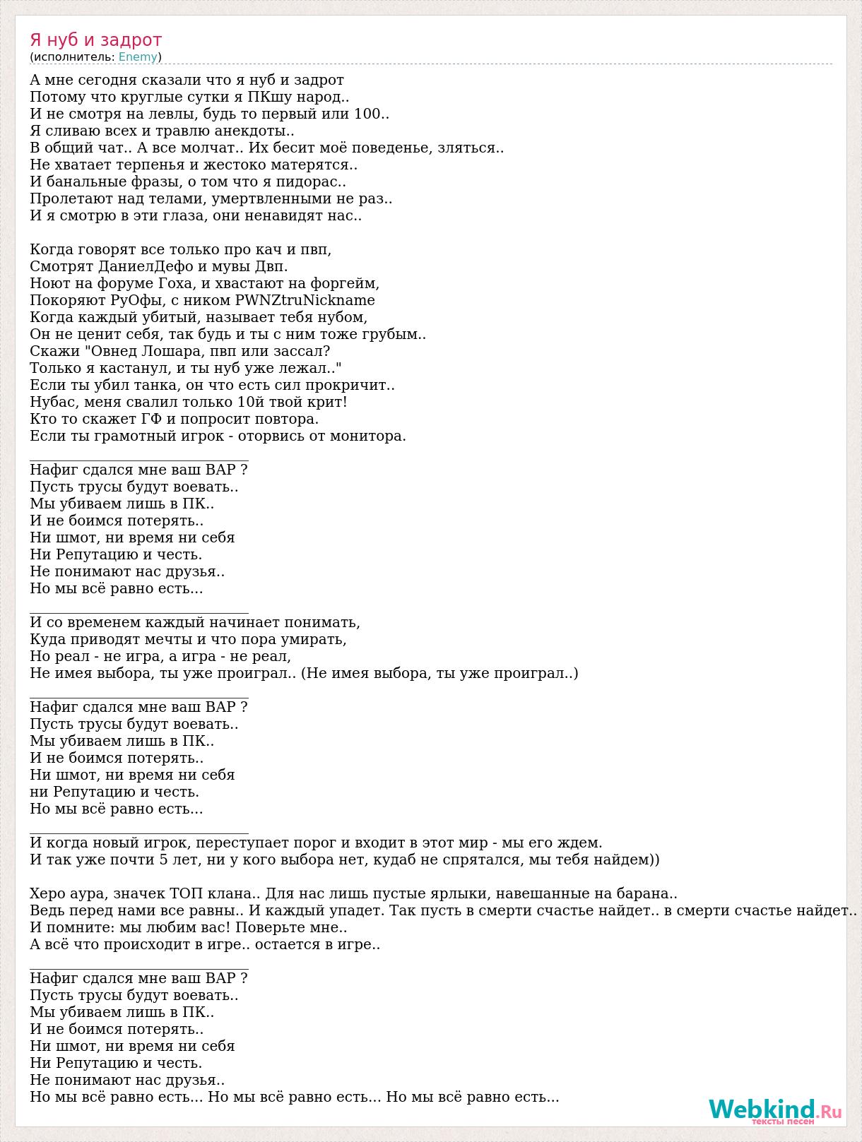 А мне сегодня сказали что я нуб и задрот Потому что круглые сутки я ПКшу народ.. И не смотря на левлы, будь то первый или 100.. Я сливаю всех и травлю анекдоты.. В общий чат.. А все молчат.. Их бесит моё поведенье, зляться.. Не хватает терпенья и жестоко матерятся.. И банальные фразы, о том что я пидорас.. Пролетают над телами, умертвленными не раз.. И я смотрю в эти глаза, они ненавидят нас.. Когда говорят все только про кач и пвп, Смотрят ДаниелДефо и мувы Двп. Ноют на форуме Гоха, и хвастают на форгейм, Покоряют РуОфы, с ником PWNZtruNickname Когда каждый убитый, называет тебя нубом, Он не ценит себя, так будь и ты с ним тоже грубым.. Скажи "Овнед Лошара, пвп или зассал? Только я кастанул, и ты нуб уже лежал.." Если ты убил танка, он что есть сил прокричит.. Нубас, меня свалил только 10й твой крит! Кто то скажет ГФ и попросит повтора. Если ты грамотный игрок - оторвись от монитора. _______________________________ Нафиг сдался мне ваш ВАР ? Пусть трусы будут воевать.. Мы убиваем лишь в ПК.. И не боимся потерять.. Ни шмот, ни время ни себя Ни Репутацию и честь. Не понимают нас друзья.. Но мы всё равно есть... _______________________________ И со временем каждый начинает понимать, Куда приводят мечты и что пора умирать, Но реал - не игра, а игра - не реал, Не имея выбора, ты уже проиграл.. (Не имея выбора, ты уже проиграл..) _______________________________ Нафиг сдался мне ваш ВАР ? Пусть трусы будут воевать.. Мы убиваем лишь в ПК.. И не боимся потерять.. Ни шмот, ни время ни себя ни Репутацию и честь. Но мы всё равно есть... _______________________________ И когда новый игрок, переступает порог и входит в этот мир - мы его ждем. И так уже почти 5 лет, ни у кого выбора нет, кудаб не спрятался, мы тебя найдем)) Херо аура, значек ТОП клана.. Для нас лишь пустые ярлыки, навешанные на барана.. Ведь перед нами все равны.. И каждый упадет. Так пусть в смерти счастье найдет.. в смерти счастье найдет.. И помните: мы любим вас! Поверьте мне.. А всё что происходит в игре.. остается в игре.. _______________________________ Нафиг сдался мне ваш ВАР ? Пусть трусы будут воевать.. Мы убиваем лишь в ПК.. И не боимся потерять.. Ни шмот, ни время ни себя Ни Репутацию и честь. Не понимают нас друзья.. Но мы всё равно есть... Но мы всё равно есть... Но мы всё равно есть...