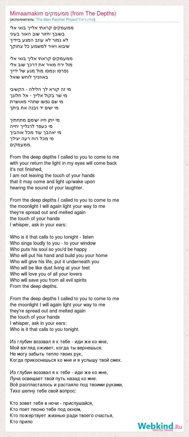 ממעמקים קראתי אלייך בואי אלי בשובך יחזור שוב האור בעיני לא גמור לא עוזב המגע ביידיך שיבוא ויאיר למשמע כל צחוקך ממעמקים קראתי אליך בואי אלי מול ירח מאיר את דרכך שוב אלי נפרסו ונמסו מול מגע של ידייך באוזנייך לוחש שואל מי זה קורא לך הלילה - הקשיבי מי שר בקול אלייך - אל חלונך מי שם נפשו שתהיי מאושרת מי ישים יד ויבנה את ביתך מי ייתן חייו ישימם מתחתיך מי כעפר לרגלייך יחייה מי יאהבך עוד מכל אוהביך מי מכל רוח רעה יצילך ממעמקים. From the deep depths I called to you to come to me with your return the light in my eyes will come back it's not finished, I am not leaving the touch of your hands that it may come and light up/wake upon hearing the sound of your laughter. From the deep depths I called to you to come to me the moonlight I will again light your way to me they're spread out and melted again the touch of your hands I whisper, ask in your ears: Who is it that calls to you tonight - listen Who sings loudly to you - to your window Who puts his soul so you'd be happy Who will put his hand and build you your home Who will give his life, put it underneath you Who will be like dust living at your feet Who will love you of all your lovers Who will save you from all evil spirits From the deep depths. From the deep depths I called to you to come to me the moonlight I will again light your way to me they're spread out and melted again the touch of your hands I whisper, ask in your ears: Who is it that calls to you tonight. Из глубин воззвал я к тебе - иди же ко мне, Мой взгляд оживет, когда ты вернешься. Не могу забыть тепло твоих рук, Когда прикоснешься ко мне и я услышу твой смех. Из глубин воззвал я к тебе - иди же ко мне, Луна освещает твой путь назад ко мне. Всё распласталось и растаяло под твоими руками, Тихо шепну тебе свой вопрос: Кто зовет тебя в ночи - прислушайся, Кто поет песню тебе под окном, Кто пожертвует жизнью ради твоего счастья, Кто прило