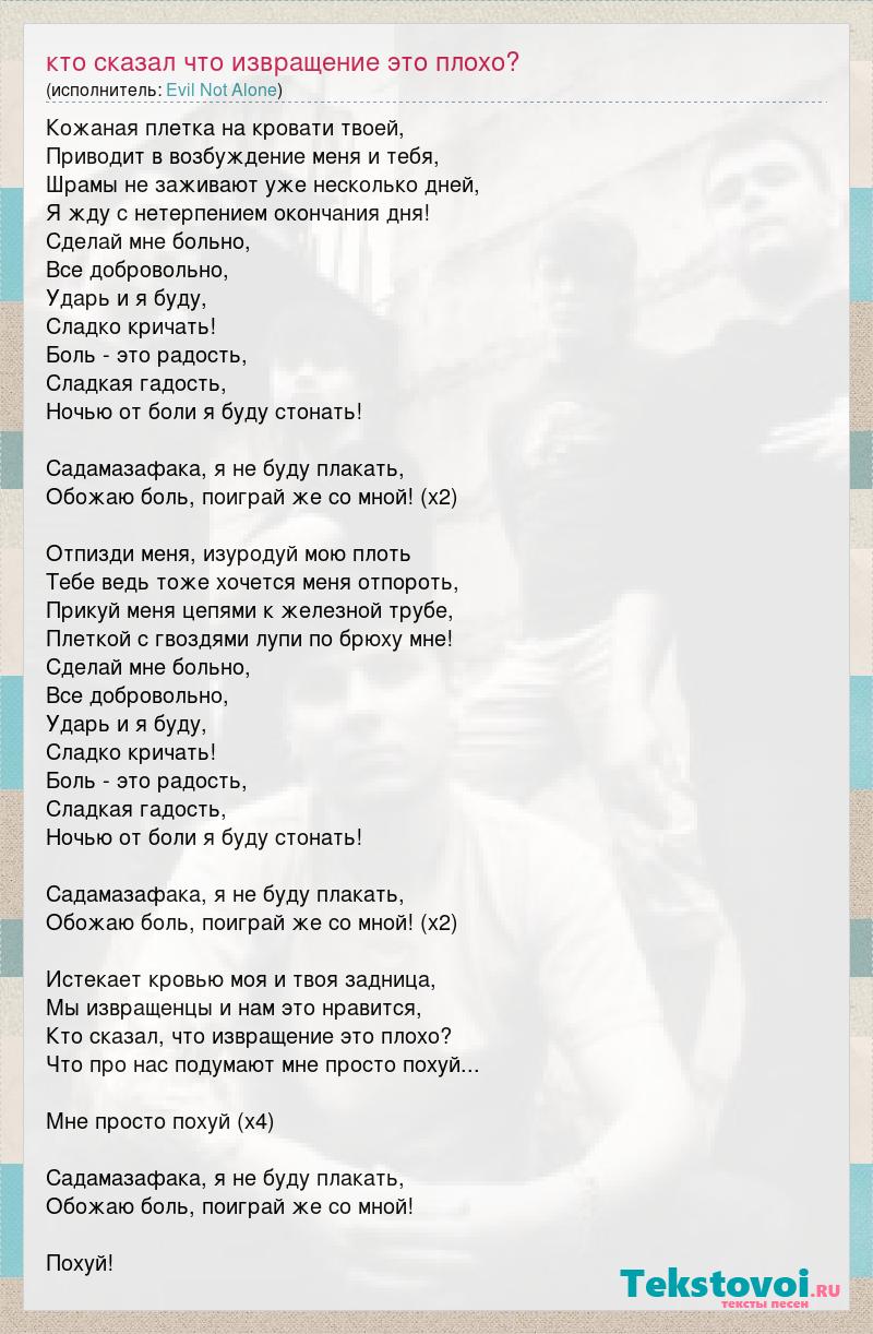 Кожаная плетка на кровати твоей, Приводит в возбуждение меня и тебя, Шрамы не заживают уже несколько дней, Я жду с нетерпением окончания дня! Сделай мне больно, Все добровольно, Ударь и я буду, Сладко кричать! Боль - это радость, Сладкая гадость, Ночью от боли я буду стонать! Садамазафака, я не буду плакать, Обожаю боль, поиграй же со мной! (х2) Отпизди меня, изуродуй мою плоть Тебе ведь тоже хочется меня отпороть, Прикуй меня цепями к железной трубе, Плеткой с гвоздями лупи по брюху мне! Сделай мне больно, Все добровольно, Ударь и я буду, Сладко кричать! Боль - это радость, Сладкая гадость, Ночью от боли я буду стонать! Садамазафака, я не буду плакать, Обожаю боль, поиграй же со мной! (х2) Истекает кровью моя и твоя задница, Мы извращенцы и нам это нравится, Кто сказал, что извращение это плохо? Что про нас подумают мне просто похуй... Мне просто похуй (х4) Садамазафака, я не буду плакать, Обожаю боль, поиграй же со мной! Похуй!