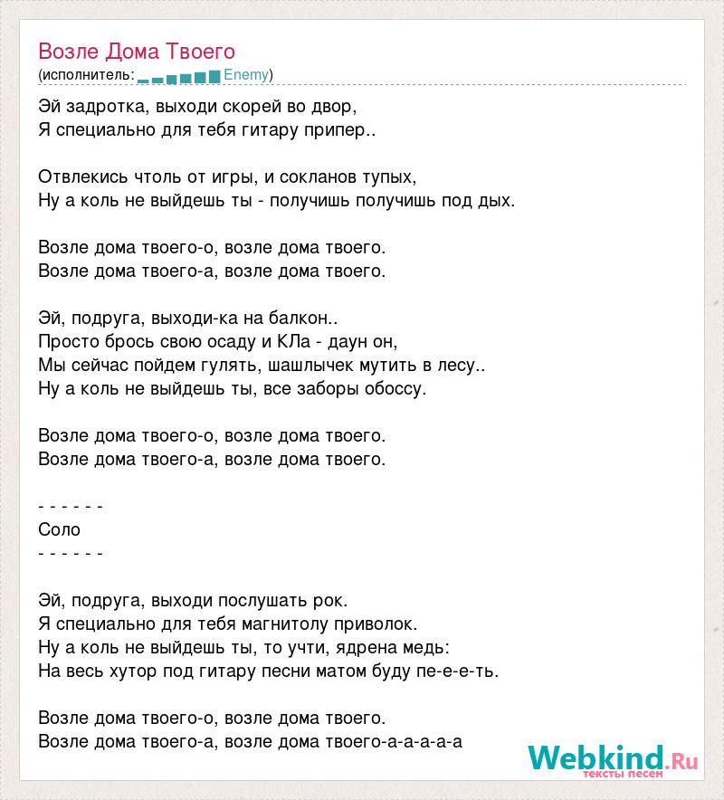 Эй задротка, выходи скорей во двор, Я специально для тебя гитару припер.. Отвлекись чтоль от игры, и сокланов тупых, Ну а коль не выйдешь ты - получишь получишь под дых. Возле дома твоего-о, возле дома твоего. Возле дома твоего-а, возле дома твоего. Эй, подруга, выходи-ка на балкон.. Просто брось свою осаду и КЛа - даун он, Мы сейчас пойдем гулять, шашлычек мутить в лесу.. Ну а коль не выйдешь ты, все заборы обоссу. Возле дома твоего-о, возле дома твоего. Возле дома твоего-а, возле дома твоего. - - - - - - Соло - - - - - - Эй, подруга, выходи послушать рок. Я специально для тебя магнитолу приволок. Ну а коль не выйдешь ты, то учти, ядрена медь: На весь хутор под гитару песни матом буду пе-е-е-ть. Возле дома твоего-о, возле дома твоего. Возле дома твоего-а, возле дома твоего-а-а-а-а-а