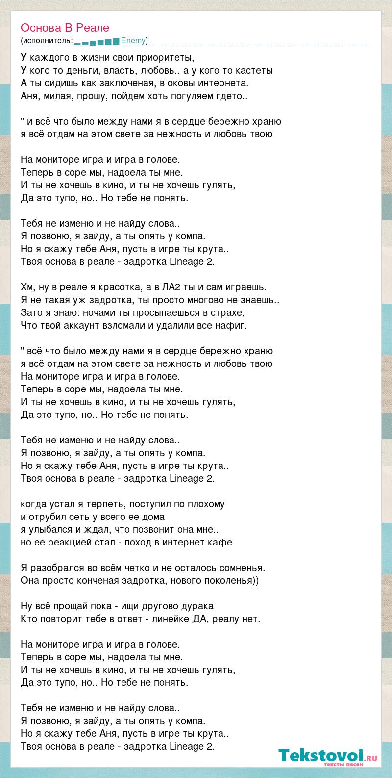 У каждого в жизни свои приоритеты, У кого то деньги, власть, любовь.. а у кого то кастеты А ты сидишь как заключеная, в оковы интернета. Аня, милая, прошу, пойдем хоть погуляем гдето.. " и всё что было между нами я в сердце бережно храню я всё отдам на этом свете за нежность и любовь твою На мониторе игра и игра в голове. Теперь в соре мы, надоела ты мне. И ты не хочешь в кино, и ты не хочешь гулять, Да это тупо, но.. Но тебе не понять. Тебя не изменю и не найду слова.. Я позвоню, я зайду, а ты опять у компа. Но я скажу тебе Аня, пусть в игре ты крута.. Твоя основа в реале - задротка Lineage 2. Хм, ну в реале я красотка, а в ЛА2 ты и сам играешь. Я не такая уж задротка, ты просто многово не знаешь.. Зато я знаю: ночами ты просыпаешься в страхе, Что твой аккаунт взломали и удалили все нафиг. " всё что было между нами я в сердце бережно храню я всё отдам на этом свете за нежность и любовь твою На мониторе игра и игра в голове. Теперь в соре мы, надоела ты мне. И ты не хочешь в кино, и ты не хочешь гулять, Да это тупо, но.. Но тебе не понять. Тебя не изменю и не найду слова.. Я позвоню, я зайду, а ты опять у компа. Но я скажу тебе Аня, пусть в игре ты крута.. Твоя основа в реале - задротка Lineage 2. когда устал я терпеть, поступил по плохому и отрубил сеть у всего ее дома я улыбался и ждал, что позвонит она мне.. но ее реакцией стал - поход в интернет кафе Я разобрался во всём четко и не осталось сомненья. Она просто конченая задротка, нового поколенья)) Ну всё прощай пока - ищи другово дурака Кто повторит тебе в ответ - линейке ДА, реалу нет. На мониторе игра и игра в голове. Теперь в соре мы, надоела ты мне. И ты не хочешь в кино, и ты не хочешь гулять, Да это тупо, но.. Но тебе не понять. Тебя не изменю и не найду слова.. Я позвоню, я зайду, а ты опять у компа. Но я скажу тебе Аня, пусть в игре ты крута.. Твоя основа в реале - задротка Lineage 2.
