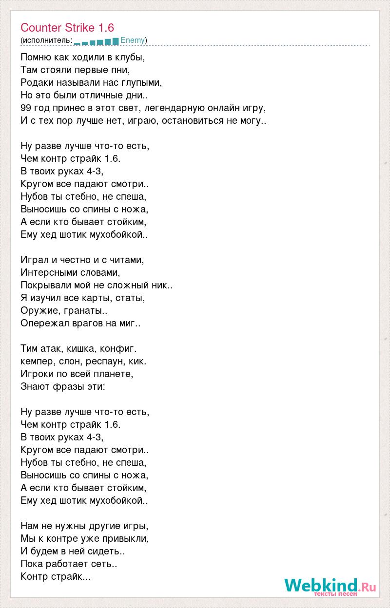 Помню как ходили в клубы, Там стояли первые пни, Родаки называли нас глупыми, Но это были отличные дни.. 99 год принес в этот свет, легендарную онлайн игру, И с тех пор лучше нет, играю, остановиться не могу.. Ну разве лучше что-то есть, Чем контр страйк 1.6. В твоих руках 4-3, Кругом все падают смотри.. Нубов ты стебно, не спеша, Выносишь со спины с ножа, А если кто бывает стойким, Ему хед шотик мухобойкой.. Играл и честно и с читами, Интерсными словами, Покрывали мой не сложный ник.. Я изучил все карты, статы, Оружие, гранаты.. Опережал врагов на миг.. Тим атак, кишка, конфиг. кемпер, слон, респаун, кик. Игроки по всей планете, Знают фразы эти: Ну разве лучше что-то есть, Чем контр страйк 1.6. В твоих руках 4-3, Кругом все падают смотри.. Нубов ты стебно, не спеша, Выносишь со спины с ножа, А если кто бывает стойким, Ему хед шотик мухобойкой.. Нам не нужны другие игры, Мы к контре уже привыкли, И будем в ней сидеть.. Пока работает сеть.. Контр страйк...