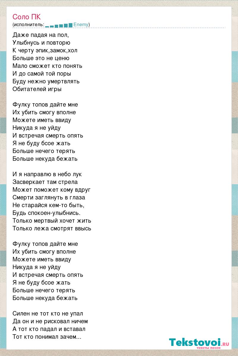Даже падая на пол, Улыбнусь и повторю К черту эпик,замок,хол Больше это не ценю Мало сможет кто понять И до самой той поры Буду нежно умертвлять Обитателей игры Фулку топов дайте мне Их убить смогу вполне Можете иметь ввиду Никуда я не уйду И встречая смерть опять Я не буду бсое жать Больше нечего терять Больше некуда бежать И я направлю в небо лук Засверкает там стрела Может поможет кому вдруг Смерти заглянуть в глаза Не старайся кем-то быть, Будь спокоен-улыбнись. Только мертвый хочет жить Только лежа смотрят ввысь Фулку топов дайте мне Их убить смогу вполне Можете иметь ввиду Никуда я не уйду И встречая смерть опять Я не буду бсое жать Больше нечего терять Больше некуда бежать Силен не тот кто не упал Да он и не рисковал ничем А тот кто падал и вставал Тот кто понимал зачем...