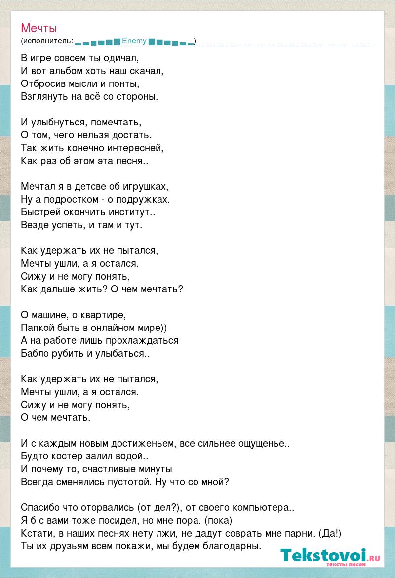 В игре совсем ты одичал, И вот альбом хоть наш скачал, Отбросив мысли и понты, Взглянуть на всё со стороны. И улыбнуться, помечтать, О том, чего нельзя достать. Так жить конечно интересней, Как раз об этом эта песня.. Мечтал я в детсве об игрушках, Ну а подростком - о подружках. Быстрей окончить институт.. Везде успеть, и там и тут. Как удержать их не пытался, Мечты ушли, а я остался. Сижу и не могу понять, Как дальше жить? О чем мечтать? О машине, о квартире, Папкой быть в онлайном мире)) А на работе лишь прохлаждаться Бабло рубить и улыбаться.. Как удержать их не пытался, Мечты ушли, а я остался. Сижу и не могу понять, О чем мечтать. И с каждым новым достиженьем, все сильнее ощущенье.. Будто костер залил водой.. И почему то, счастливые минуты Всегда сменялись пустотой. Ну что со мной? Спасибо что оторвались (от дел?), от своего компьютера.. Я б с вами тоже посидел, но мне пора. (пока) Кстати, в наших песнях нету лжи, не дадут соврать мне парни. (Да!) Ты их друзьям всем покажи, мы будем благодарны.
